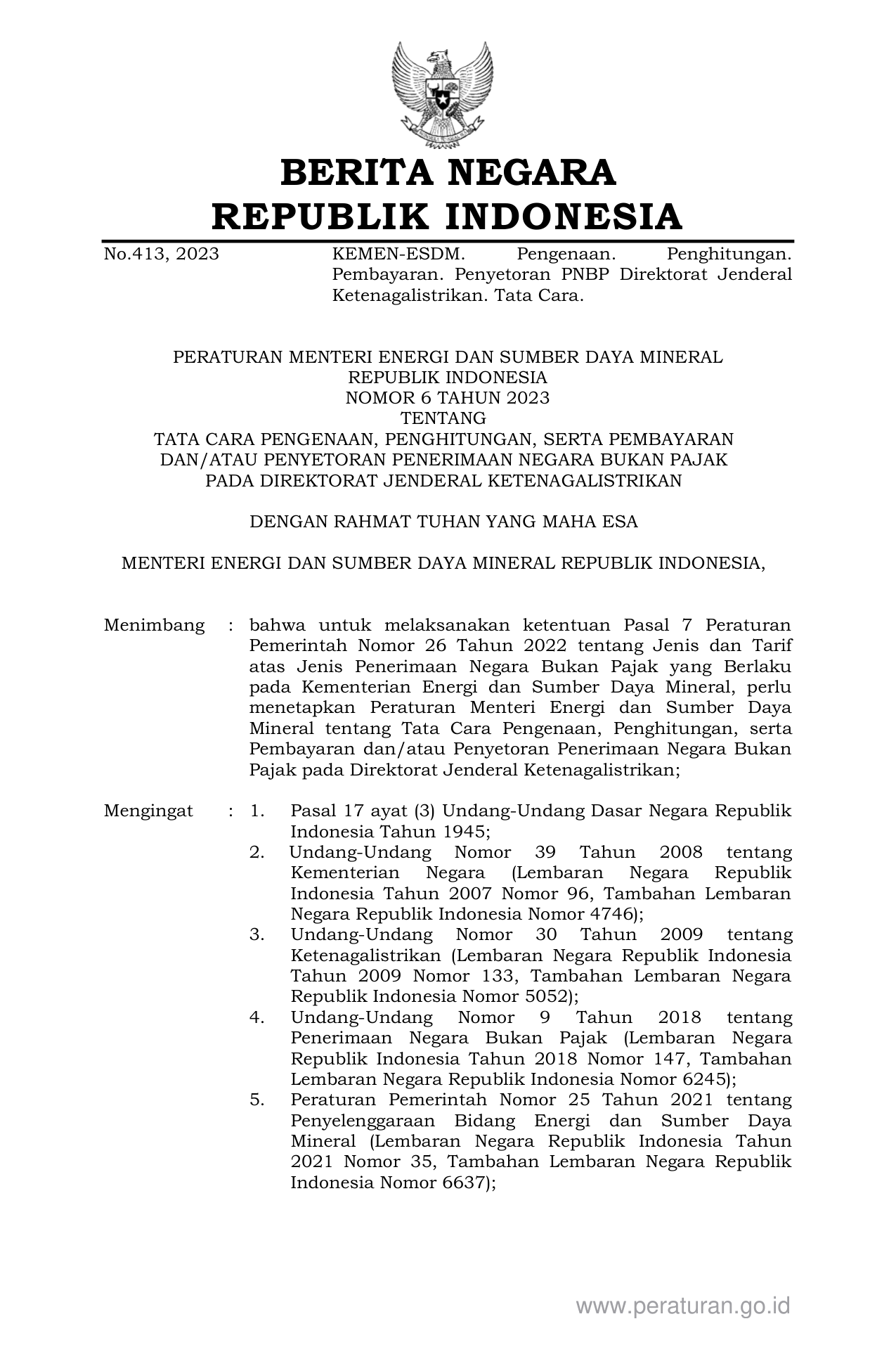 PERMEN Nomor 6 Tahun 2023 | Peraturan Menteri Nomor 6 Tahun 2023 tentang TATA CARA PENGENAAN, PENGHITUNGAN, SERTA PEMBAYARAN DAN/ATAU PENYETORAN PENERIMAAN NEGARA BUKAN PAJAK PADA DIREKTORAT JENDERAL KETENAGALISTRIKAN