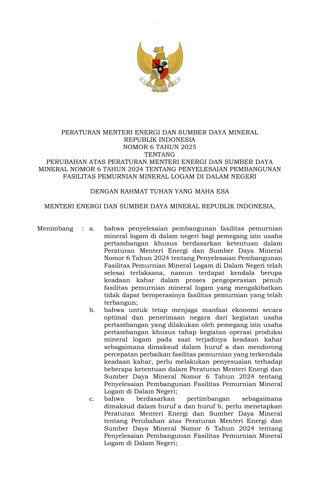 PERMEN Nomor 6 Tahun 2025 | Peraturan Menteri Nomor 6 Tahun 2025 tentang Perubahan atas Peraturan Menteri Energi dan Sumber Daya Mineral Nomor 6 Tahun 2024 tentang Penyelesaian Pembangunan Fasilitas Pemurnian Mineral Logam di Dalam Negeri
