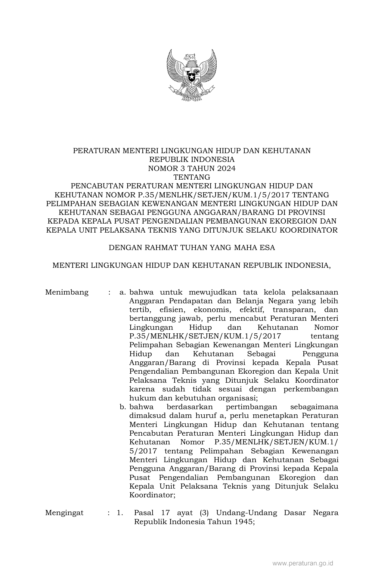 PERMEN Nomor 3 Tahun 2024 | Peraturan Menteri Nomor 3 Tahun 2024 tentang PENCABUTAN PERATURAN MENTERI LINGKUNGAN HIDUP DAN KEHUTANAN NOMOR P.35/MENLHK/SETJEN/KUM.1/5/2017 TENTANG PELIMPAHAN SEBAGIAN KEWENANGAN MENTERI LINGKUNGAN HIDUP DAN KEHUTANAN SEBAGAI PENGGUNA ANGGARAN/BARANG DI PROVINSI KEPADA KEPALA PUSAT PENGENDALIAN PEMBANGUNAN EKOREGION DAN KEPALA UNIT PELAKSANA TEKNIS YANG DITUNJUK SELAKU KOORDINATOR