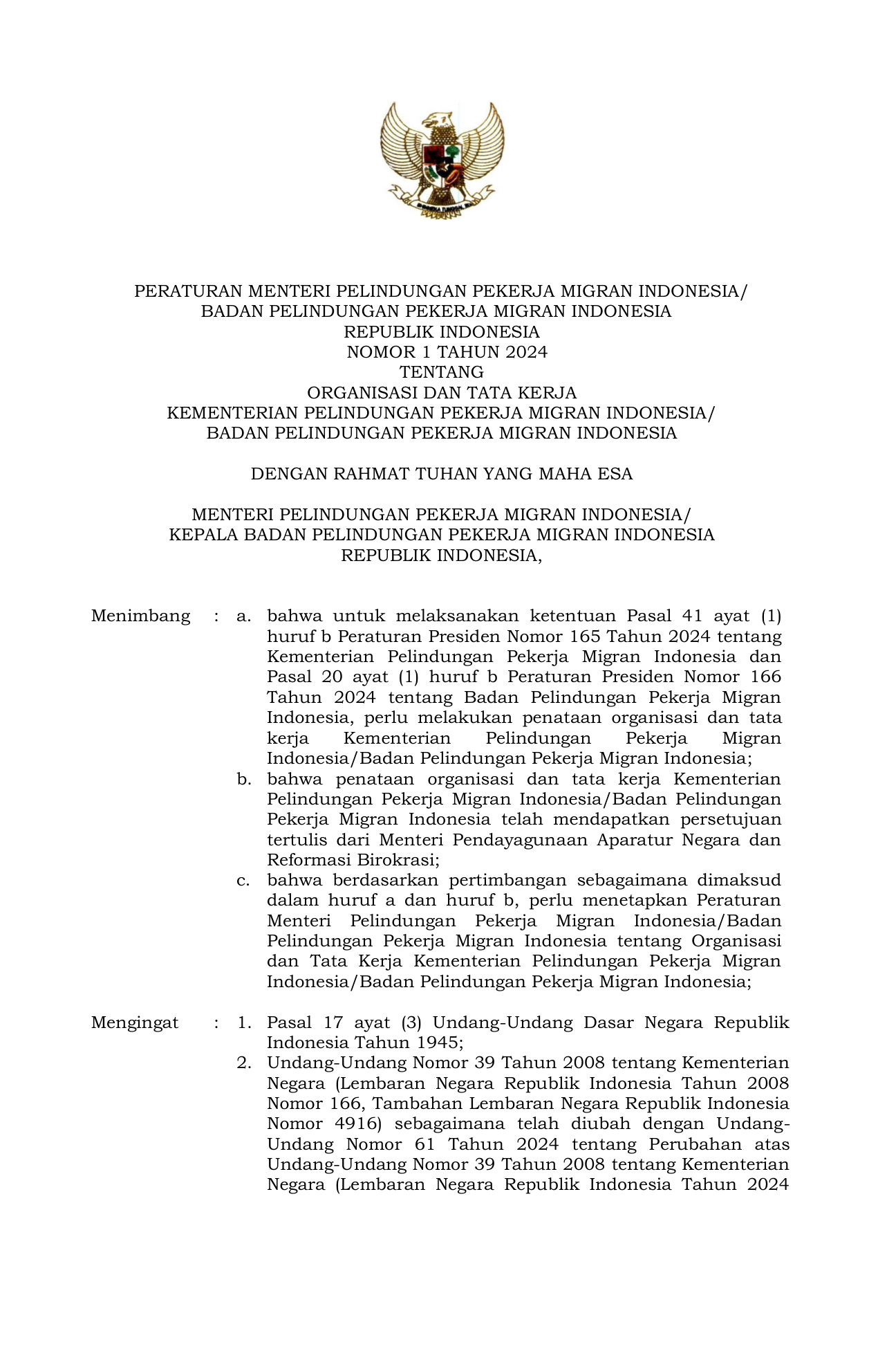 PERMEN Nomor 1 Tahun 2024 | Peraturan Menteri Nomor 1 Tahun 2024 tentang Organisasi dan Tata Kerja Kementerian Pelindungan Pekerja Migran Indonesia/Badan Pelindungan Pekerja Migran Indonesia
