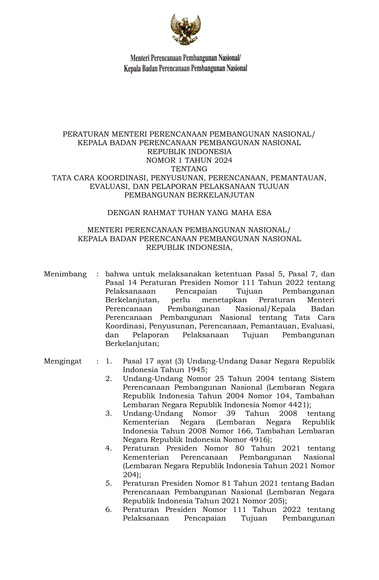 PERMEN Nomor 1 Tahun 2024 | Peraturan Menteri Nomor 1 Tahun 2024 tentang Tata Cara Koordinasi, Penyusunan, Perencanaan, Pemantauan, Evaluasi, dan Pelaporan Pelaksanaan Tujuan Pembangunan Berkelanjutan