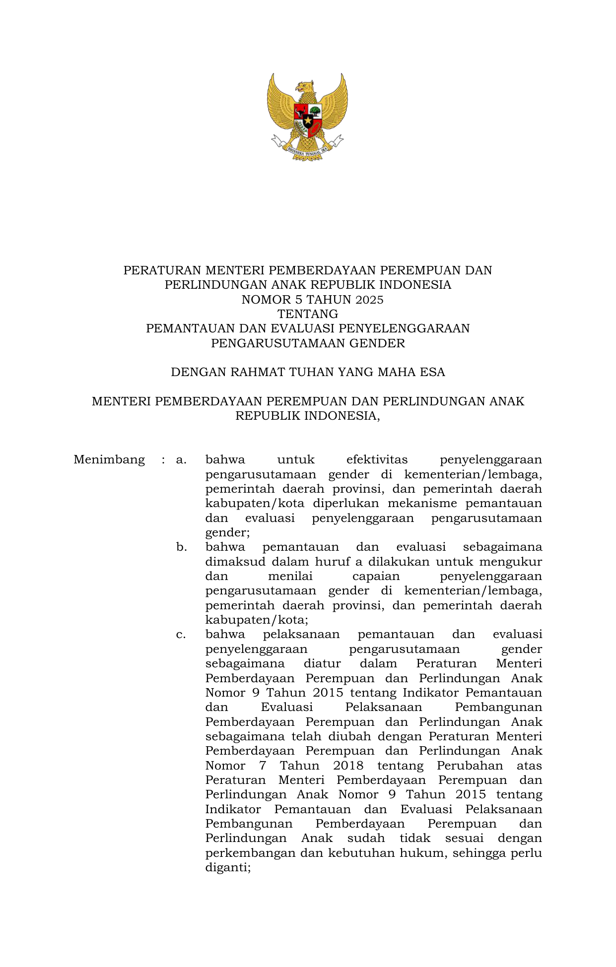 PERMEN Nomor 5 Tahun 2025 | Peraturan Menteri Nomor 5 Tahun 2025 tentang Pemantauan dan Evaluasi Penyelenggaraan Pengarusutamaan Gender