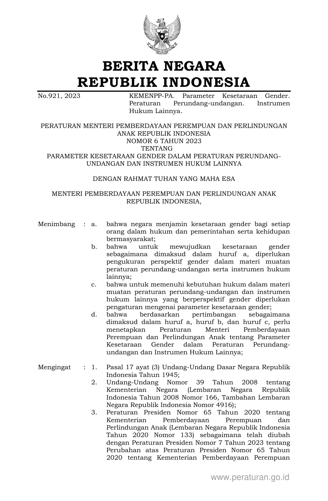 PERMEN Nomor 6 Tahun 2023 | Peraturan Menteri Nomor 6 Tahun 2023 tentang PARAMETER KESETARAAN GENDER DALAM PERATURAN PERUNDANG-UNDANGAN DAN INSTRUMEN HUKUM LAINNYA
