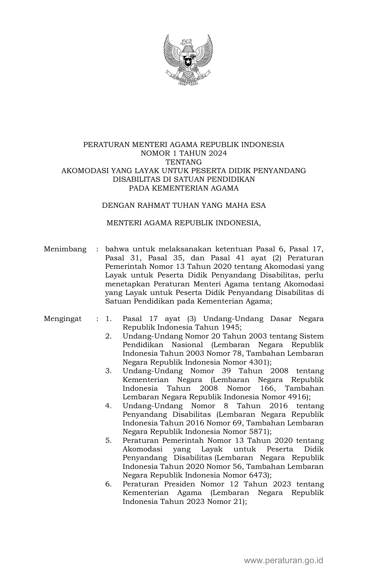 PERMEN Nomor 1 Tahun 2024 | Peraturan Menteri Nomor 1 Tahun 2024 tentang AKOMODASI YANG LAYAK UNTUK PESERTA DIDIK PENYANDANG DISABILITAS DI SATUAN PENDIDIKAN PADA KEMENTERIAN AGAMA