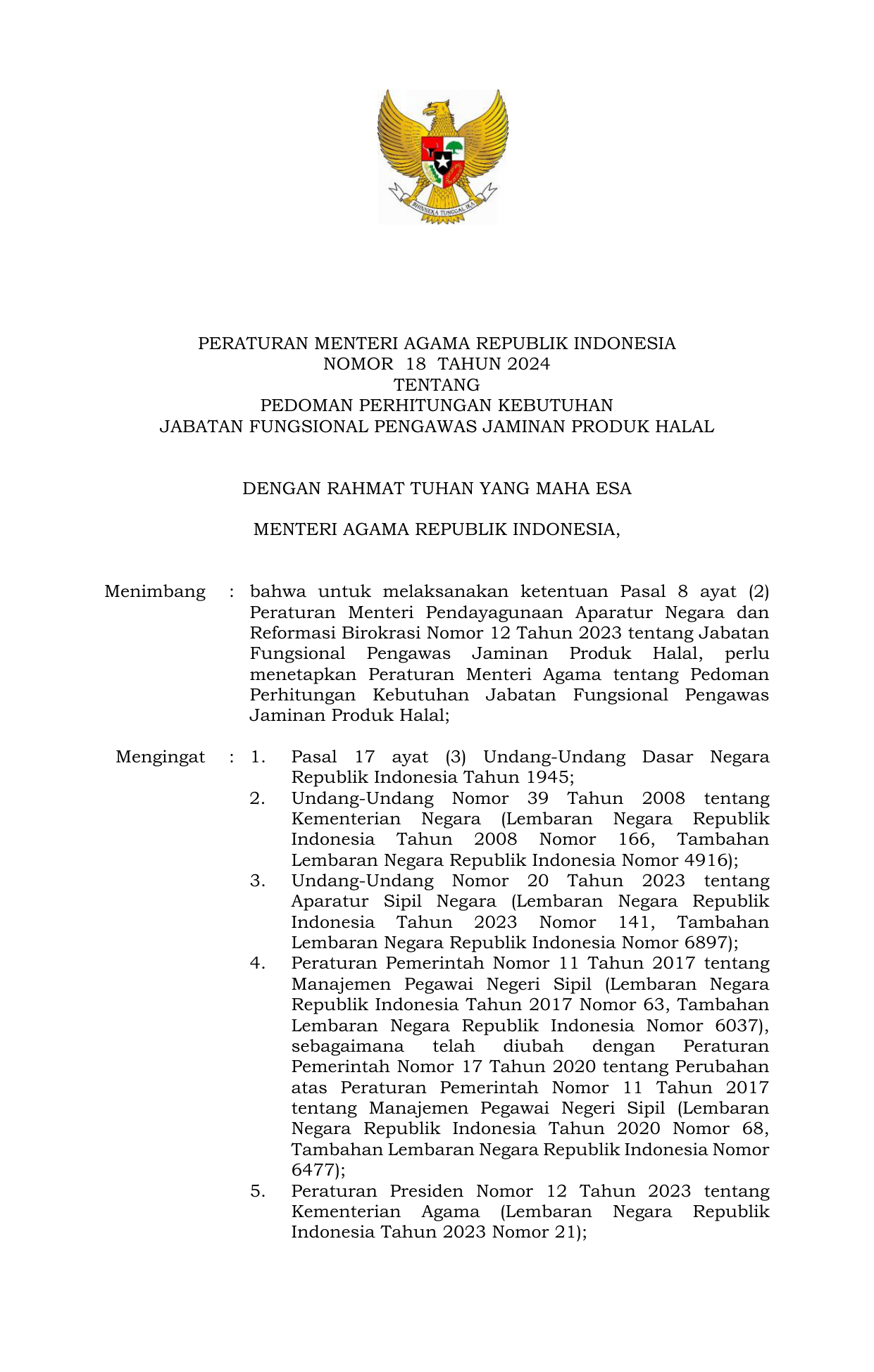 PERMEN Nomor 18 Tahun 2024 | Peraturan Menteri Nomor 18 Tahun 2024 tentang Pedoman Perhitungan Kebutuhan Jabatan Fungsional Pengawas Jaminan Produk Halal