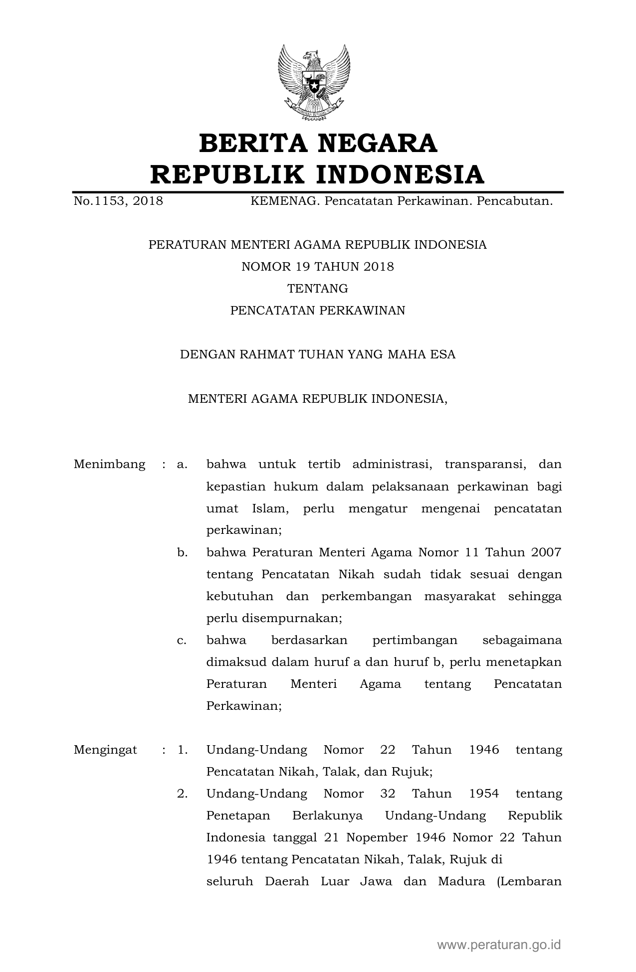 PERMEN Nomor 19 Tahun 2018 | Peraturan Menteri Nomor 19 Tahun 2018 tentang Pencatatan Perkawinan