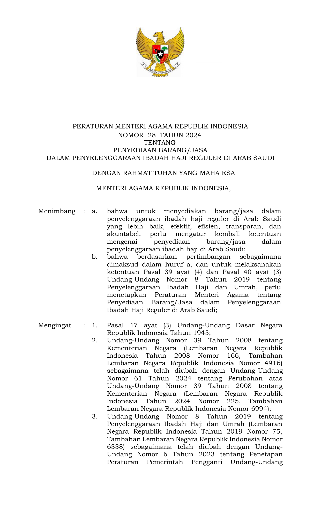 PERMEN Nomor 28 Tahun 2024 | Peraturan Menteri Nomor 28 Tahun 2024 tentang Penyediaan Barang/Jasa dalam Penyelenggaraan Ibadah Haji Reguler di Arab Saudi