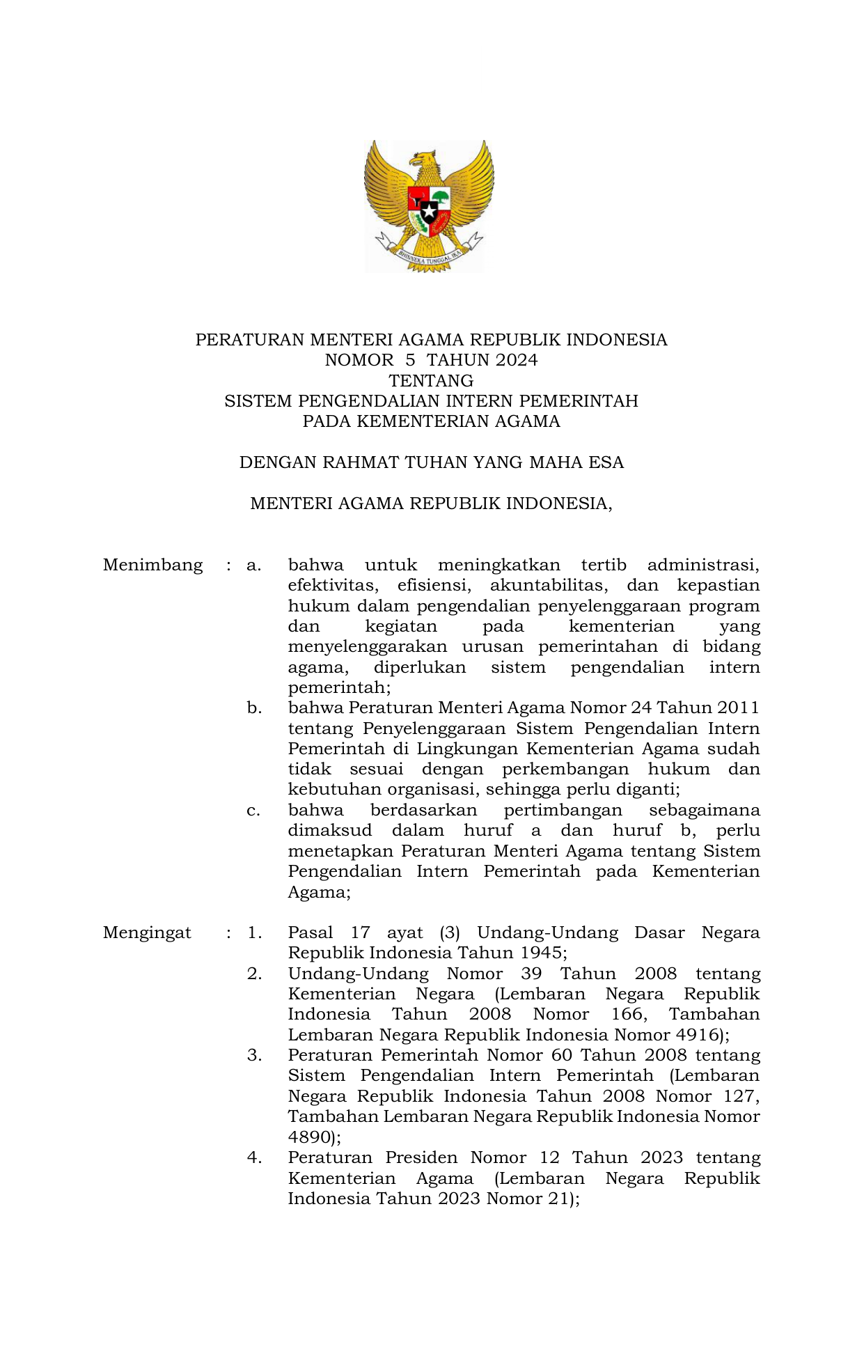 PERMEN Nomor 5 Tahun 2024 | Peraturan Menteri Nomor 5 Tahun 2024 tentang Sistem Pengendalian Intern Pemerintah pada Kementerian Agama