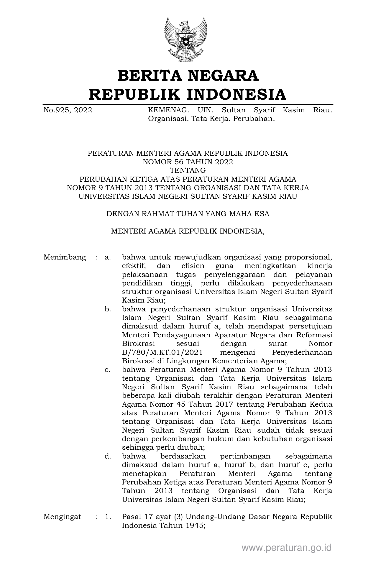 PERMEN Nomor 56 Tahun 2022 | Peraturan Menteri Nomor 56 Tahun 2022 tentang PERUBAHAN KETIGA ATAS PERATURAN MENTERI AGAMA NOMOR 9 TAHUN 2013 TENTANG ORGANISASI DAN TATA KERJA UNIVERSITAS ISLAM NEGERI SULTAN SYARIF KASIM RIAU