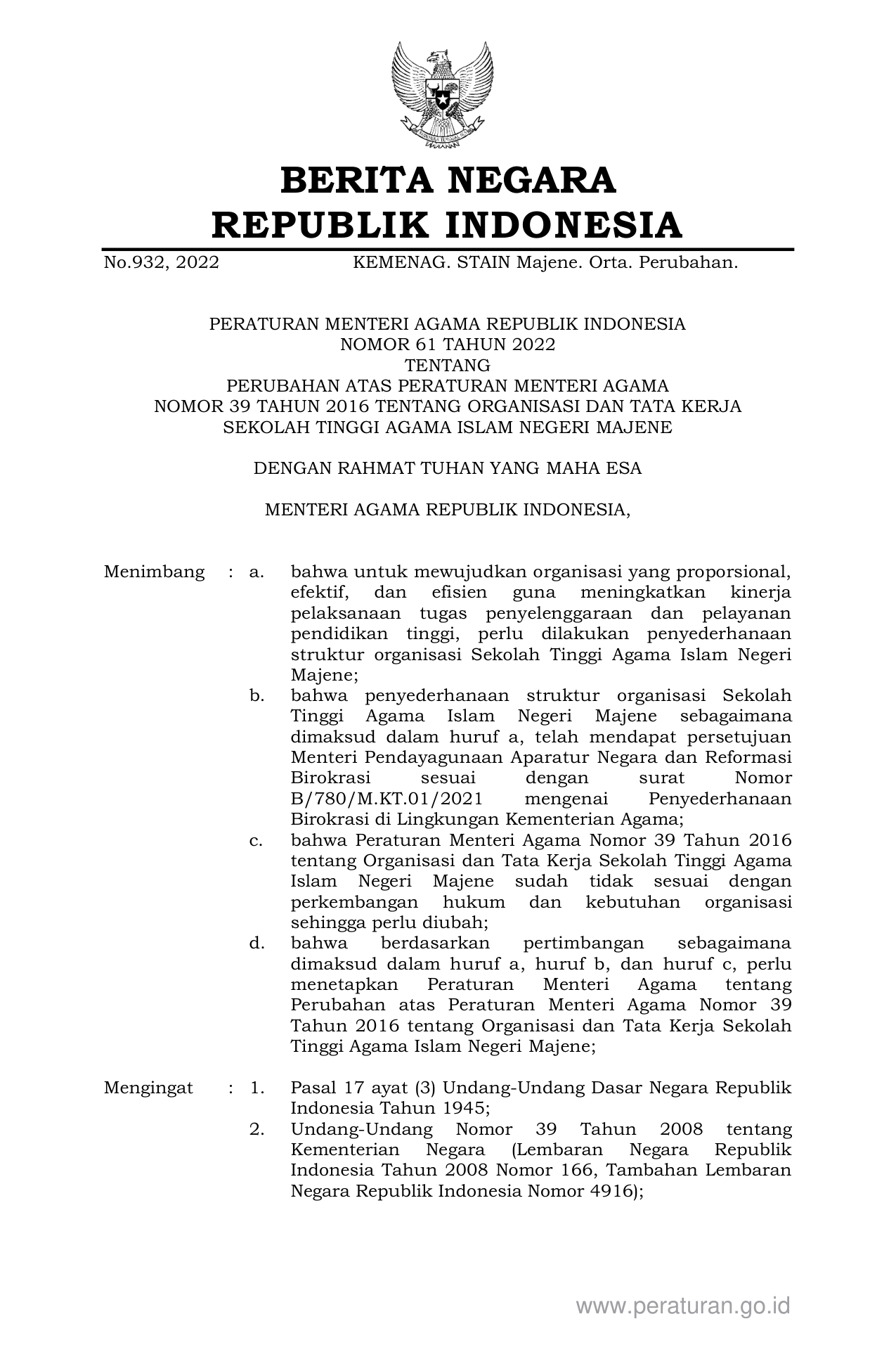 PERMEN Nomor 61 Tahun 2022 | Peraturan Menteri Nomor 61 Tahun 2022 tentang PERUBAHAN ATAS PERATURAN MENTERI AGAMA NOMOR 39 TAHUN 2016 TENTANG ORGANISASI DAN TATA KERJA SEKOLAH TINGGI AGAMA ISLAM NEGERI MAJENE