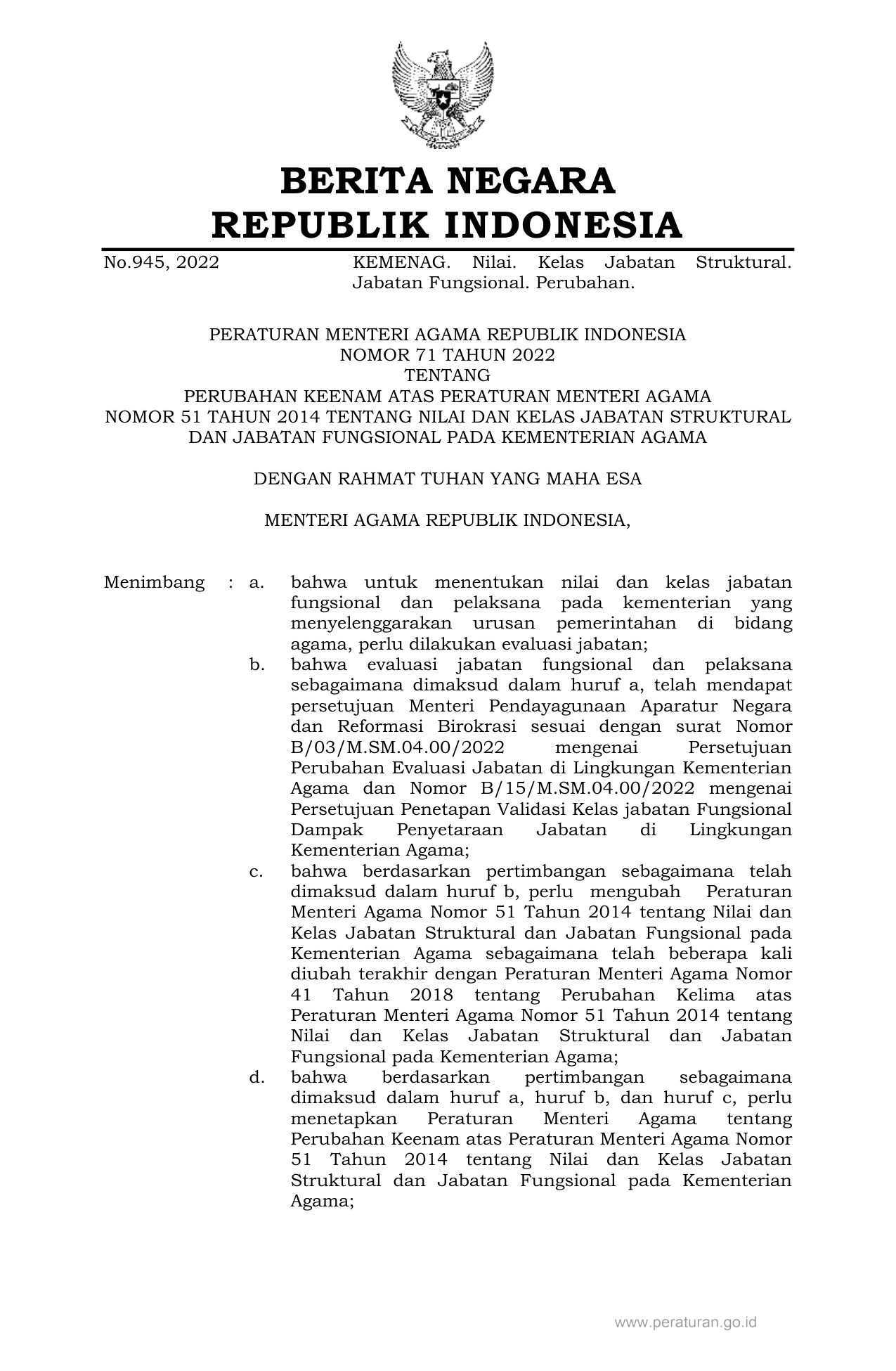 PERMEN Nomor 71 Tahun 2022 | Peraturan Menteri Nomor 71 Tahun 2022 tentang PERUBAHAN KEENAM ATAS PERATURAN MENTERI AGAMA NOMOR 51 TAHUN 2014 TENTANG NILAI DAN KELAS JABATAN STRUKTURAL DAN JABATAN FUNGSIONAL PADA KEMENTERIAN AGAMA