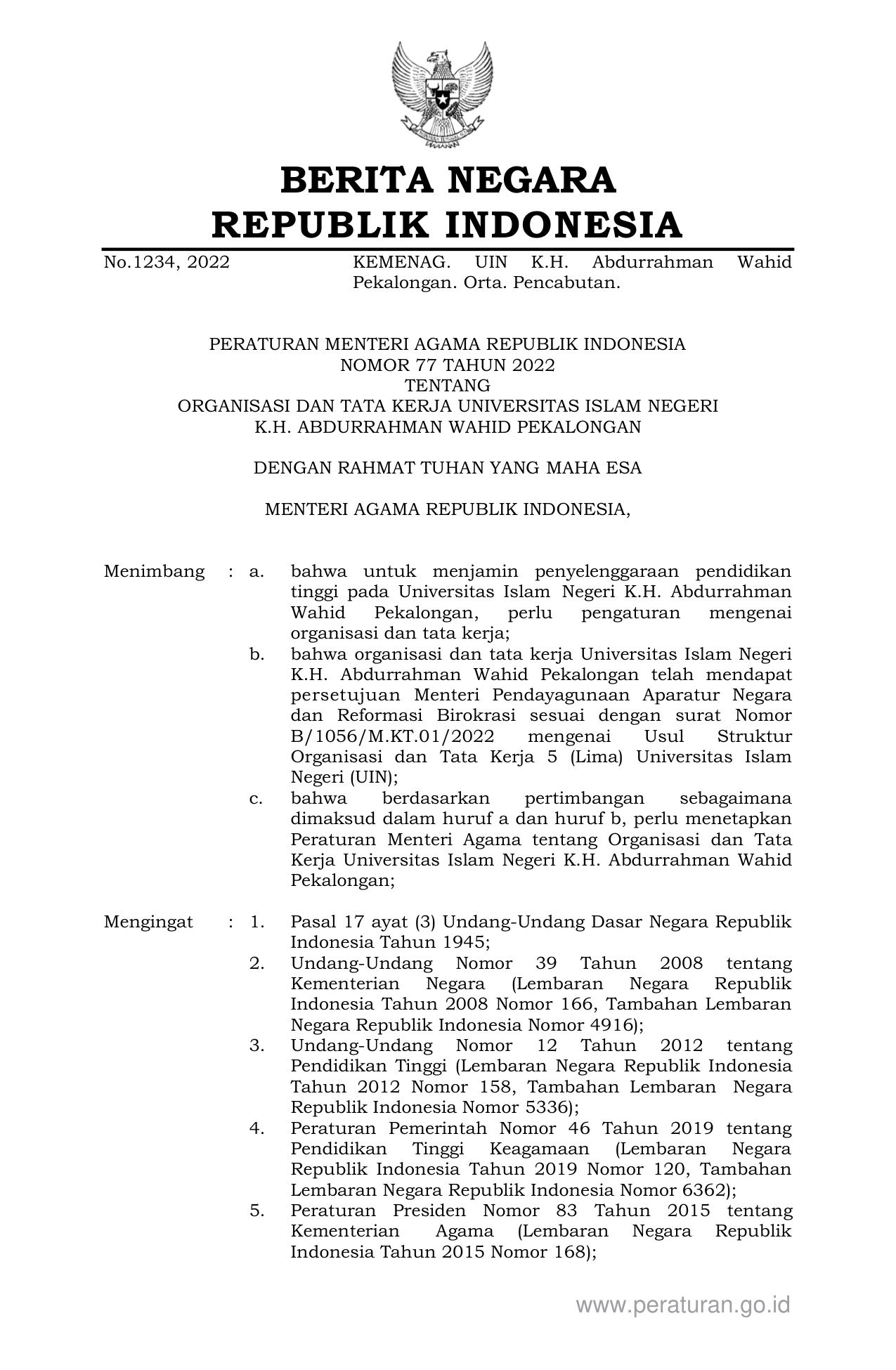 PERMEN Nomor 77 Tahun 2022 | Peraturan Menteri Nomor 77 Tahun 2022 tentang ORGANISASI DAN TATA KERJA UNIVERSITAS ISLAM NEGERI K.H. ABDURRAHMAN WAHID PEKALONGAN