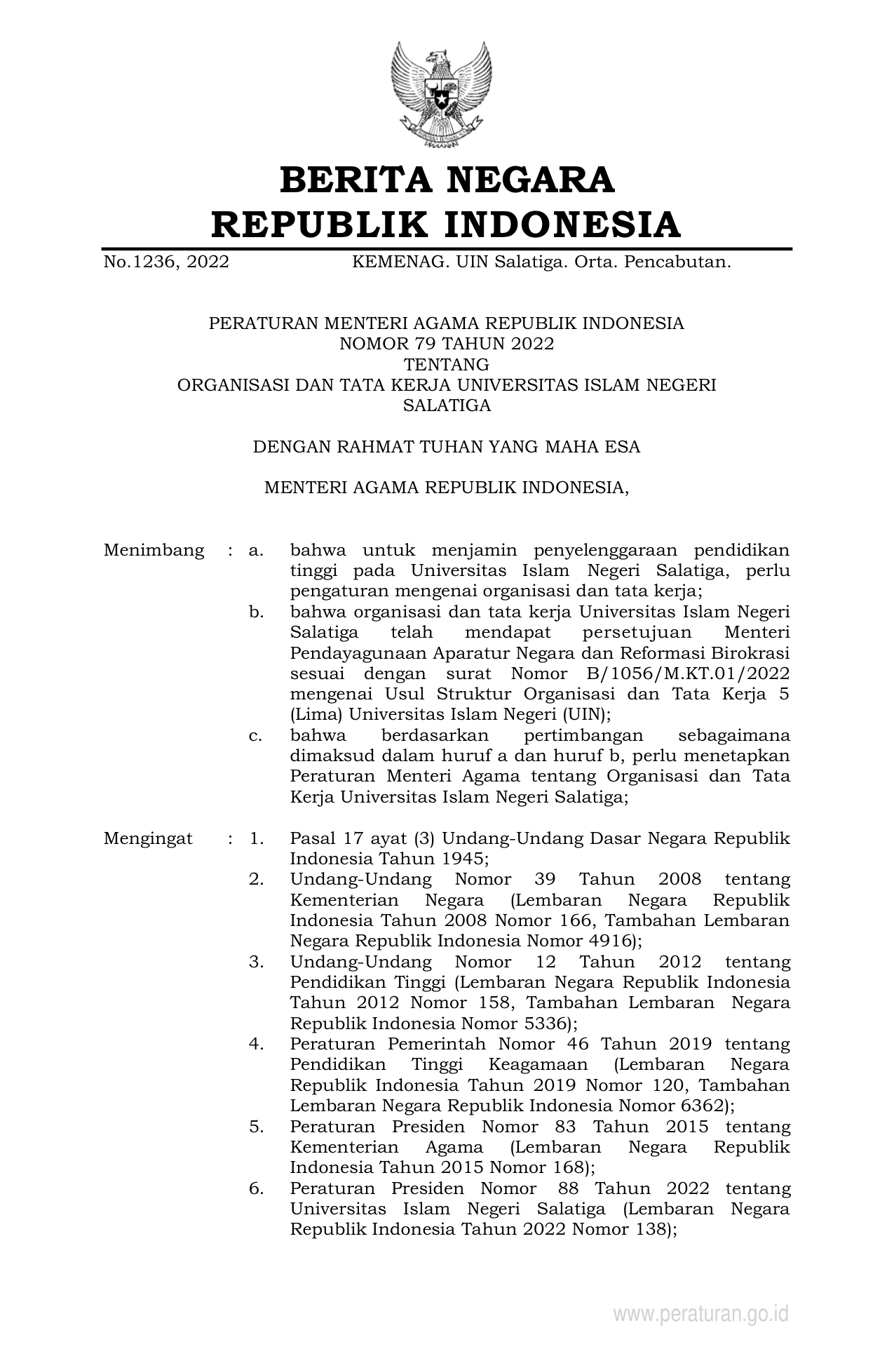 PERMEN Nomor 79 Tahun 2022 | Peraturan Menteri Nomor 79 Tahun 2022 tentang ORGANISASI DAN TATA KERJA UNIVERSITAS ISLAM NEGERI SALATIGA