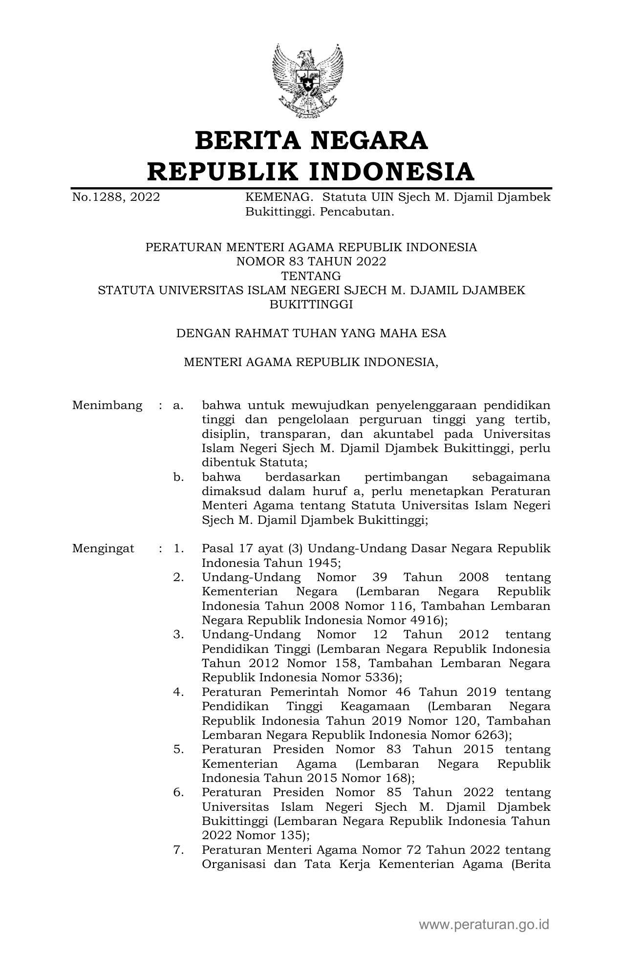 PERMEN Nomor 83 Tahun 2022 | Peraturan Menteri Nomor 83 Tahun 2022 tentang STATUTA UNIVERSITAS ISLAM NEGERI SJECH M. DJAMIL DJAMBEK BUKITTINGGI