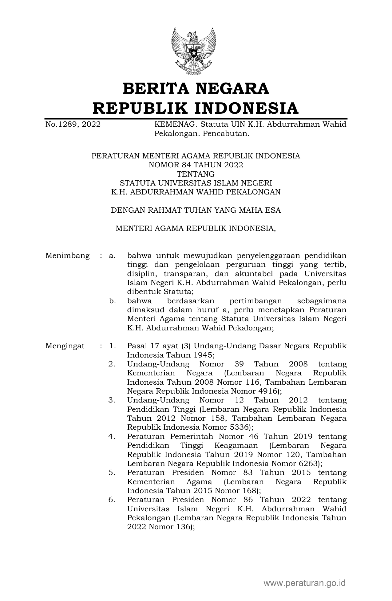 PERMEN Nomor 84 Tahun 2022 | Peraturan Menteri Nomor 84 Tahun 2022 tentang STATUTA UNIVERSITAS ISLAM NEGERI K.H. ABDURRAHMAN WAHID PEKALONGAN