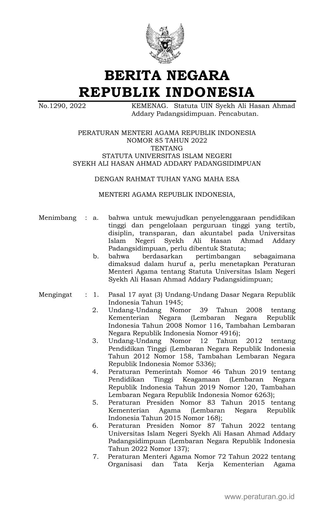 PERMEN Nomor 85 Tahun 2022 | Peraturan Menteri Nomor 85 Tahun 2022 tentang STATUTA UNIVERSITAS ISLAM NEGERI SYEKH ALI HASAN AHMAD ADDARY PADANGSIDIMPUAN