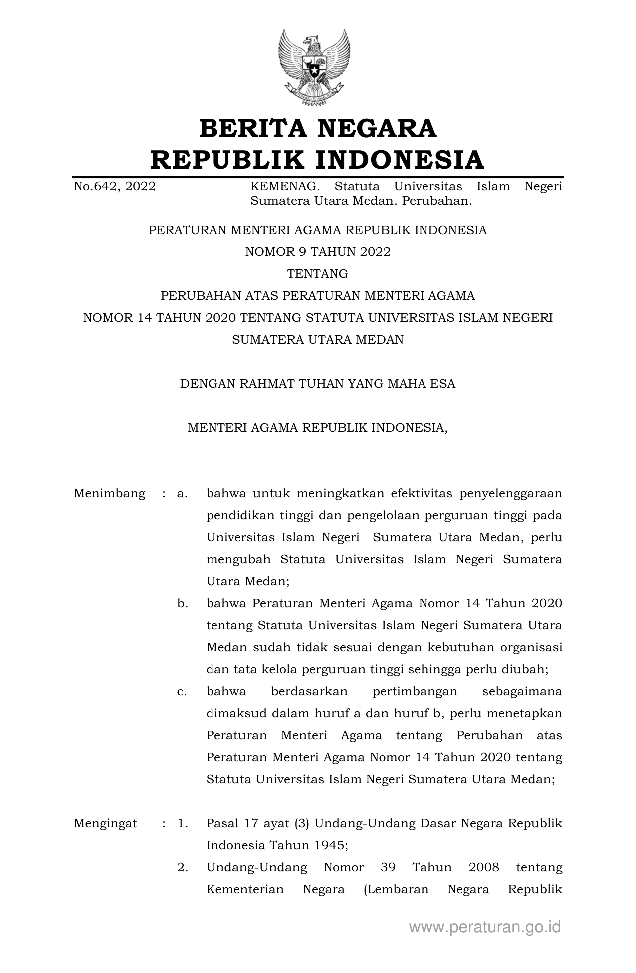 PERMEN Nomor 9 Tahun 2022 | Peraturan Menteri Nomor 9 Tahun 2022 tentang PERUBAHAN ATAS PERATURAN MENTERI AGAMA NOMOR 14 TAHUN 2020 TENTANG STATUTA UNIVERSITAS ISLAM NEGERI SUMATERA UTARA MEDAN
