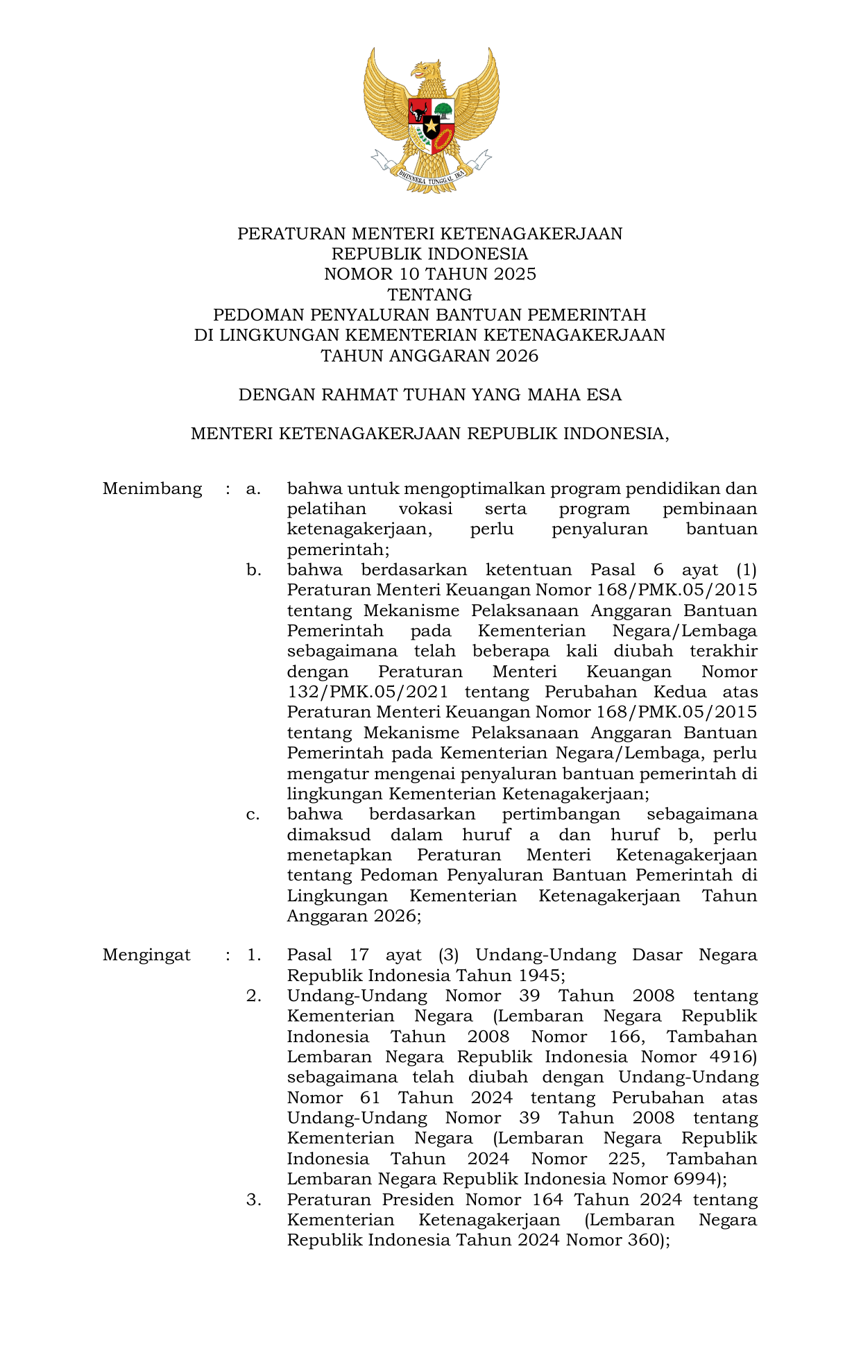 PERMEN Nomor 10 Tahun 2025 | Peraturan Menteri Nomor 10 Tahun 2025 tentang Pedoman Penyaluran Bantuan Pemerintah di Lingkungan Kementerian Ketenagakerjaan Tahun Anggaran 2026