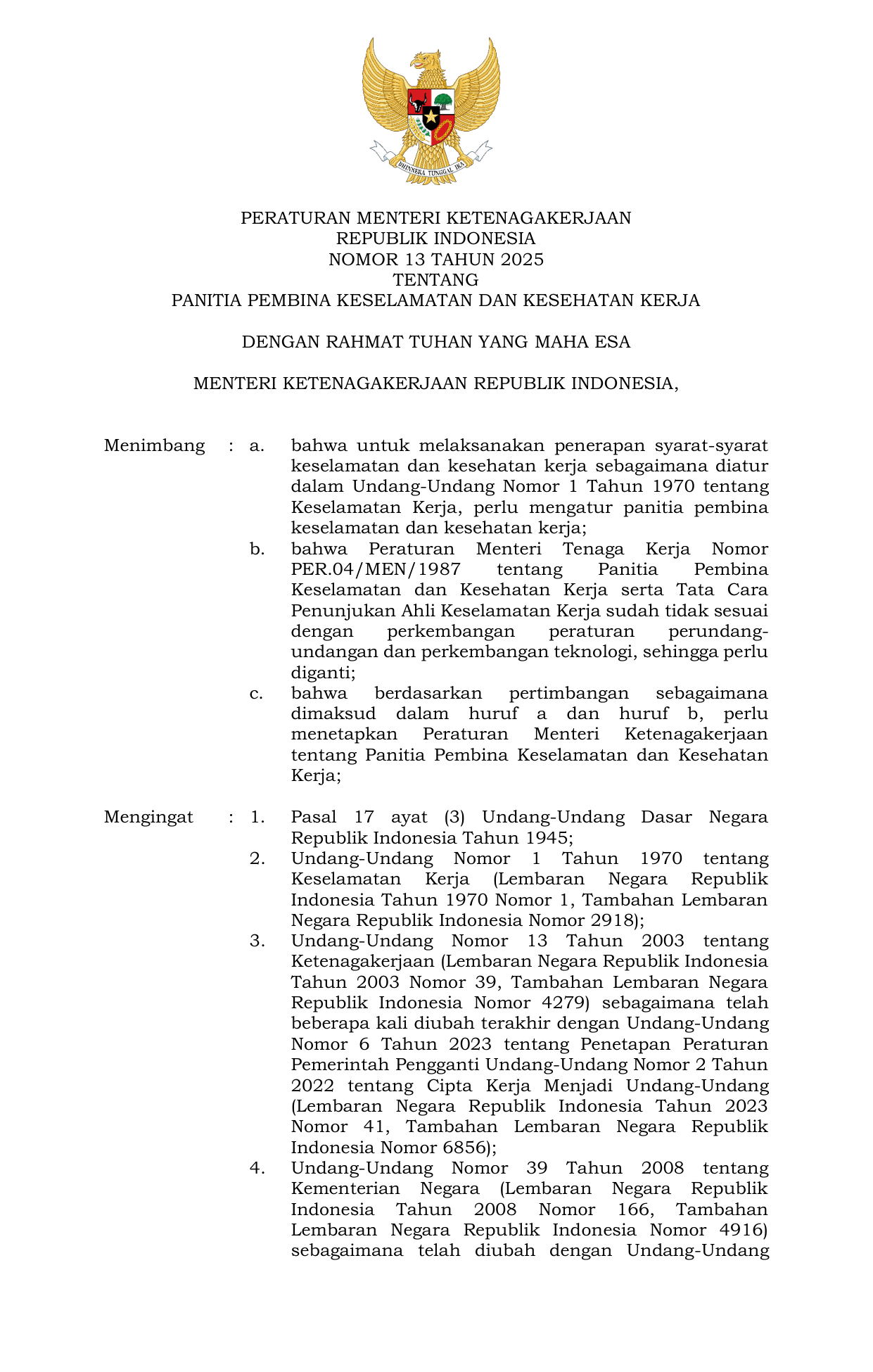PERMEN Nomor 13 Tahun 2025 | Peraturan Menteri Nomor 13 Tahun 2025 tentang Panitia Pembina Keselamatan Dan Kesehatan Kerja