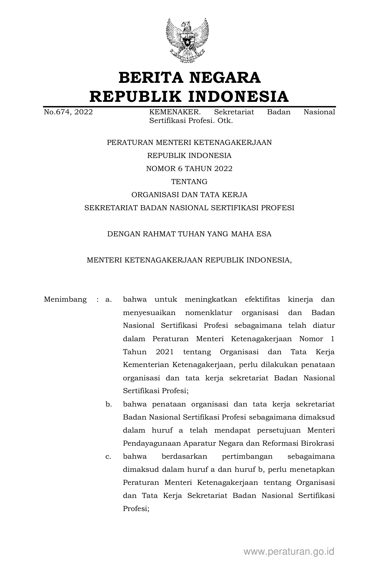PERMEN Nomor 6 Tahun 2022 | Peraturan Menteri Nomor 6 Tahun 2022 tentang ORGANISASI DAN TATA KERJA SEKRETARIAT BADAN NASIONAL SERTIFIKASI PROFESI
