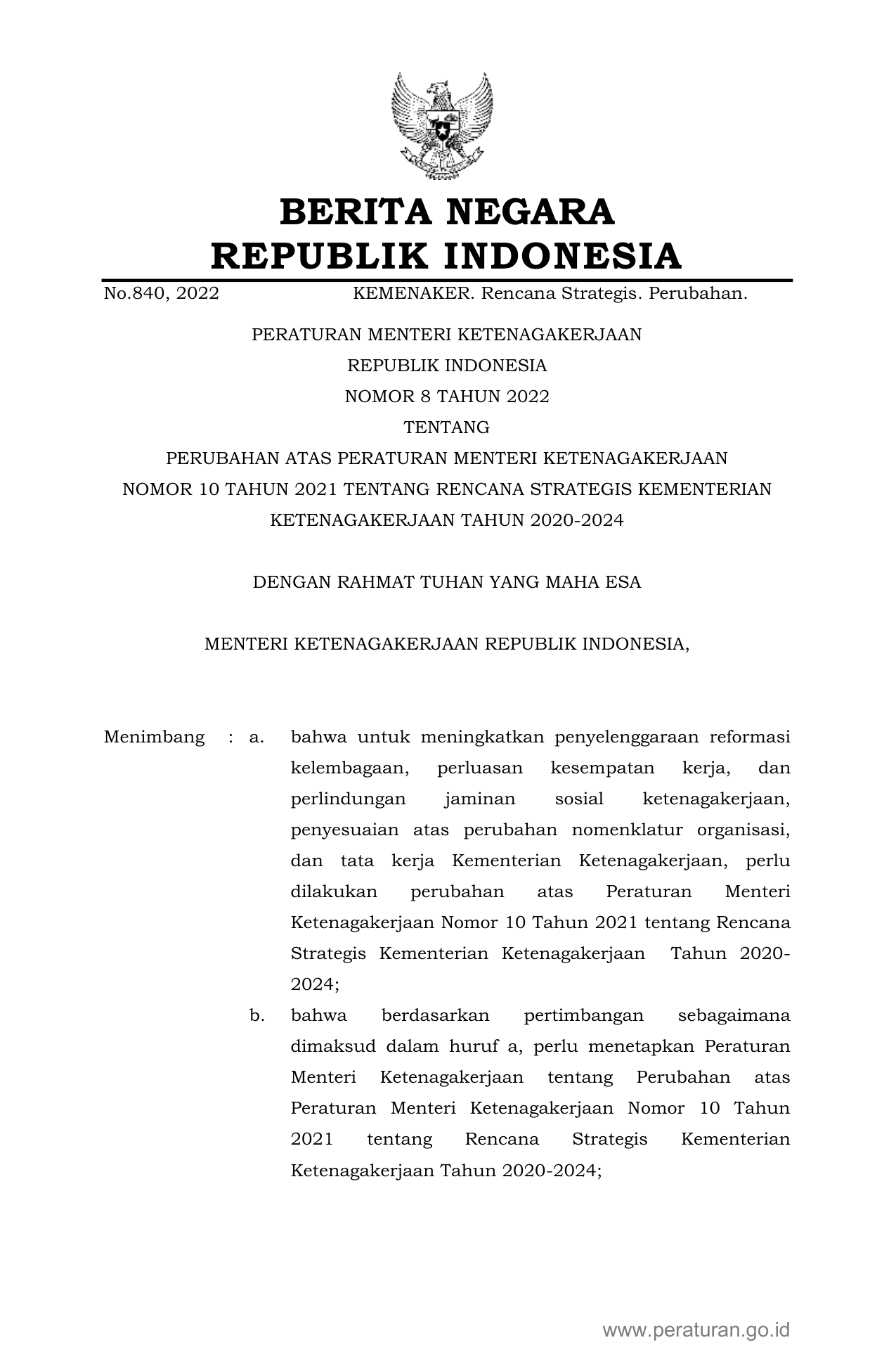 PERMEN Nomor 8 Tahun 2022 | Peraturan Menteri Nomor 8 Tahun 2022 tentang PERUBAHAN ATAS PERATURAN MENTERI KETENAGAKERJAAN NOMOR 10 TAHUN 2021 TENTANG RENCANA STRATEGIS KEMENTERIAN KETENAGAKERJAAN TAHUN 2020-2024