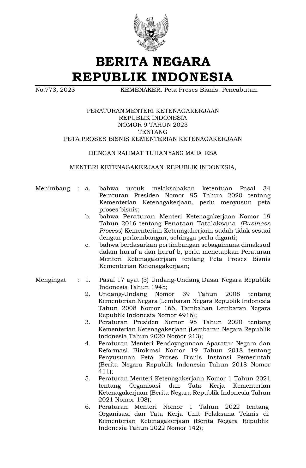 PERMEN Nomor 9 Tahun 2023 | Peraturan Menteri Nomor 9 Tahun 2023 tentang PETA PROSES BISNIS KEMENTERIAN KETENAGAKERJAAN