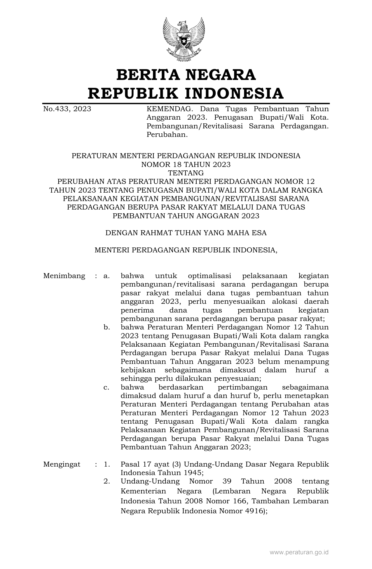 PERMEN Nomor 18 Tahun 2023 | Peraturan Menteri Nomor 18 Tahun 2023 tentang PERUBAHAN ATAS PERATURAN MENTERI PERDAGANGAN NOMOR 12 TAHUN 2023 TENTANG PENUGASAN BUPATI/WALI KOTA DALAM RANGKA PELAKSANAAN KEGIATAN PEMBANGUNAN/REVITALISASI SARANA PERDAGANGAN BERUPA PASAR RAKYAT MELALUI DANA TUGAS PEMBANTUAN TAHUN ANGGARAN 2023
