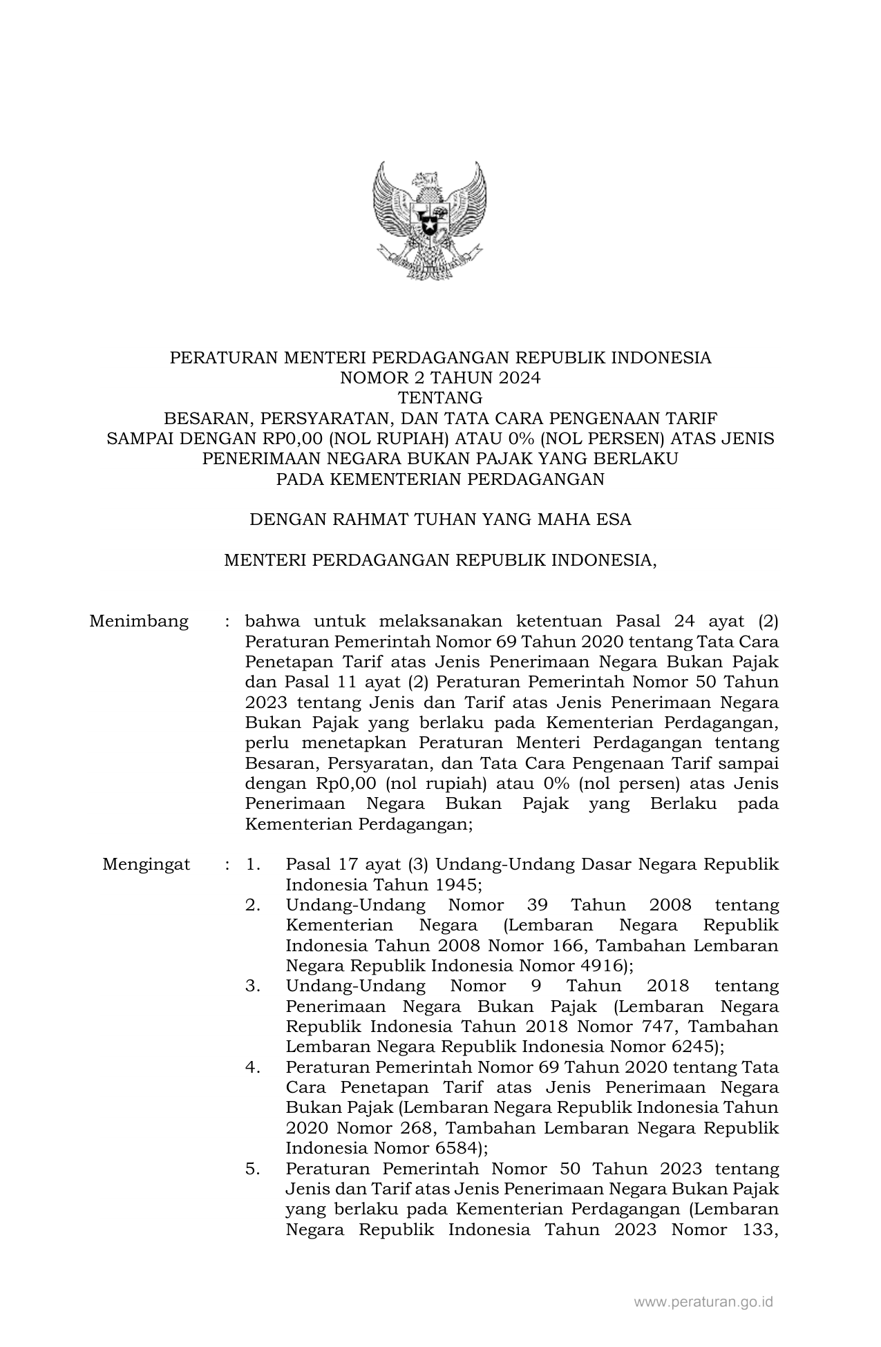 PERMEN Nomor 2 Tahun 2024 | Peraturan Menteri Nomor 2 Tahun 2024 tentang BESARAN, PERSYARATAN, DAN TATA CARA PENGENAAN TARIF SAMPAI DENGAN RP0,00 (NOL RUPIAH) ATAU 0% (NOL PERSEN) ATAS JENIS PENERIMAAN NEGARA BUKAN PAJAK YANG BERLAKU PADA KEMENTERIAN PERDAGANGAN