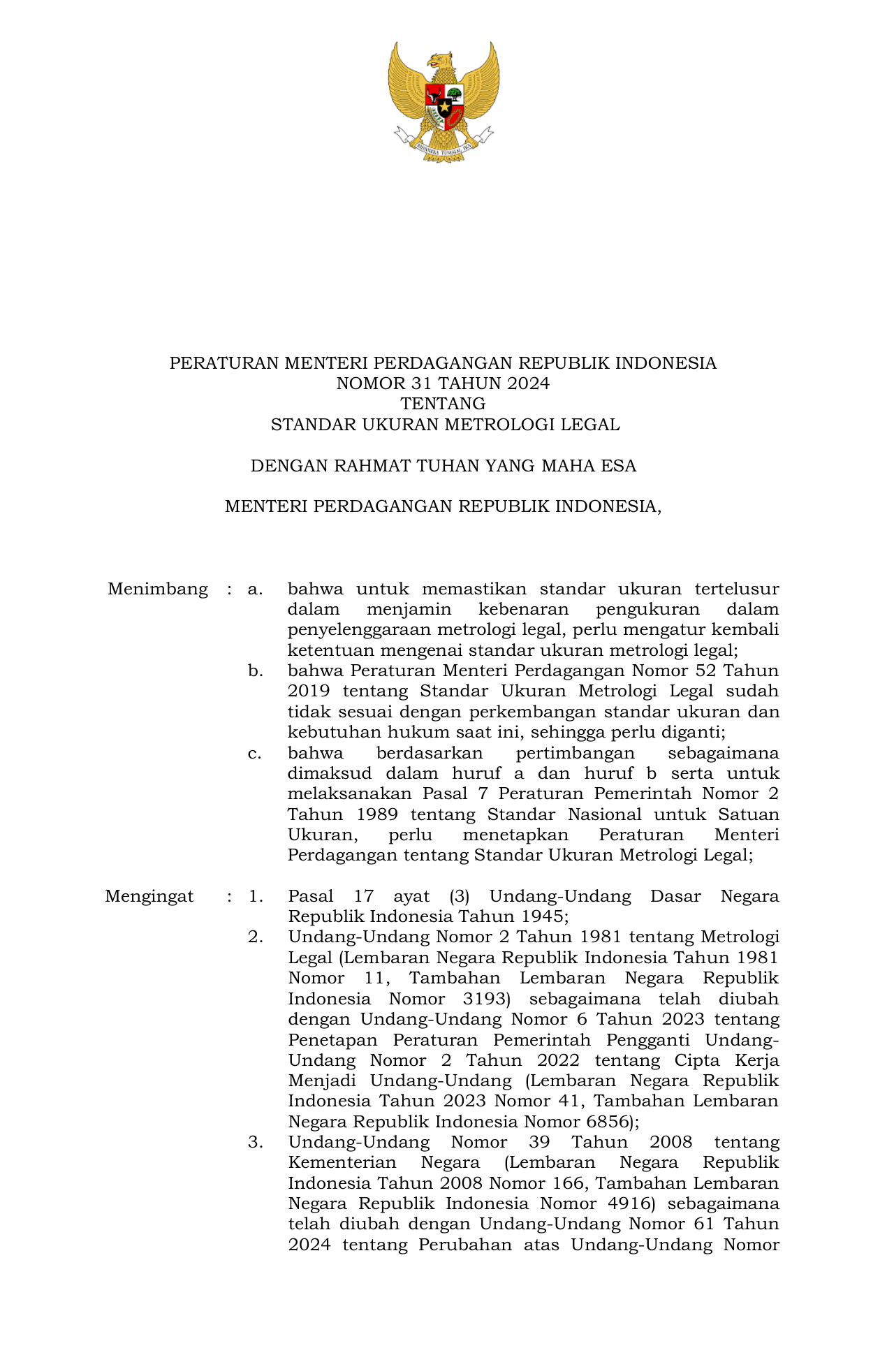 PERMEN Nomor 31 Tahun 2024 | Peraturan Menteri Nomor 31 Tahun 2024 tentang Standar Ukuran Metrologi Legal