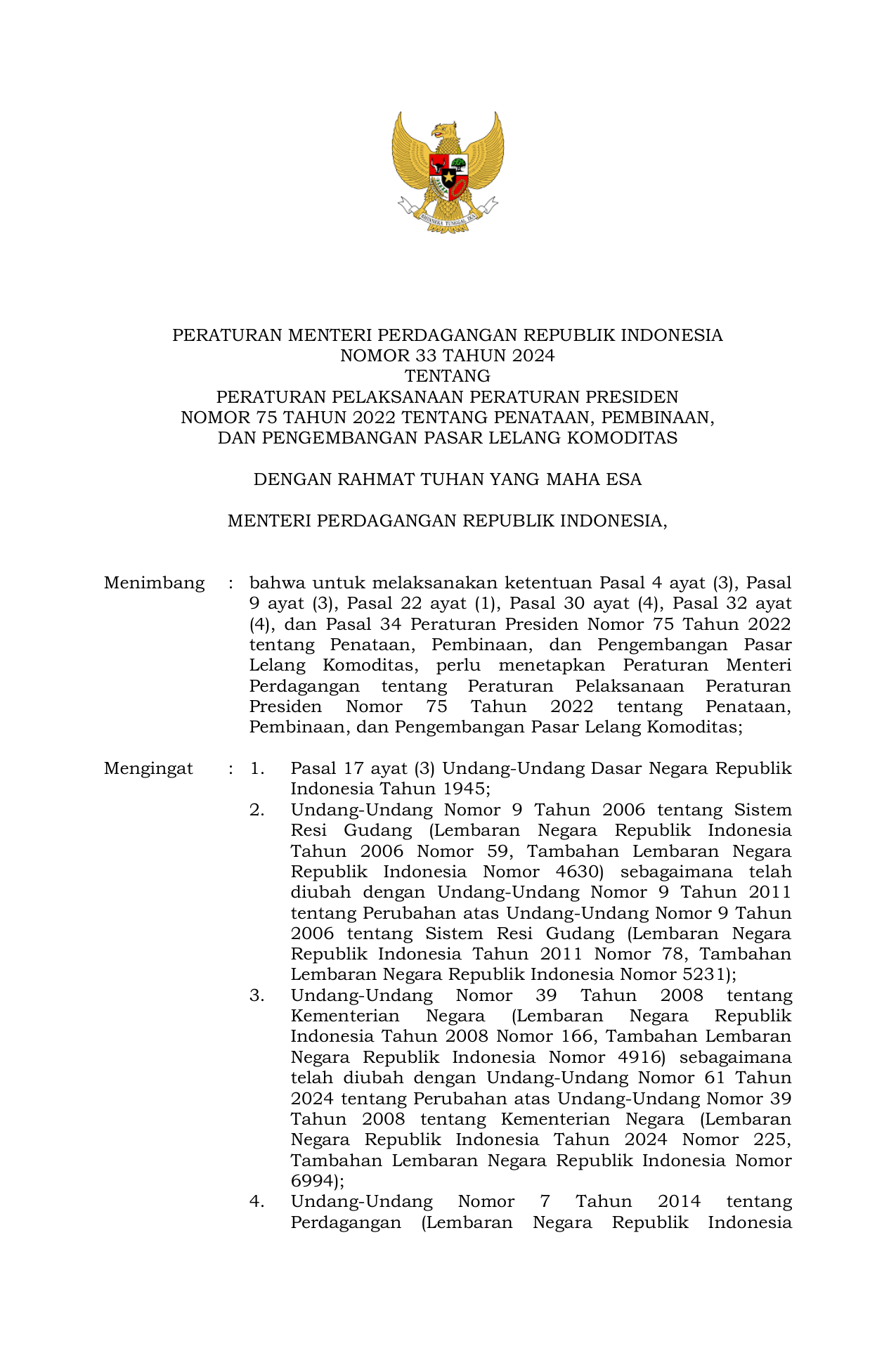 PERMEN Nomor 33 Tahun 2024 | Peraturan Menteri Nomor 33 Tahun 2024 tentang Peraturan Pelaksanaan Peraturan Presiden Nomor 75 Tahun 2022 Tentang Penataan, Pembinaan, dan Pengembangan Pasar Lelang Komoditas