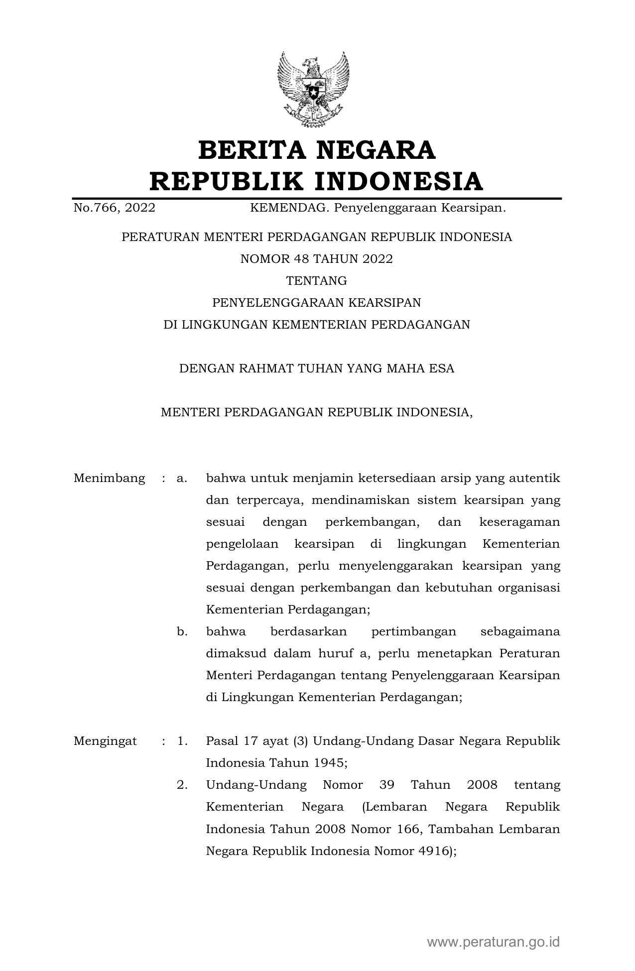 PERMEN Nomor 48 Tahun 2022 | Peraturan Menteri Nomor 48 Tahun 2022 tentang PENYELENGGARAAN KEARSIPAN DI LINGKUNGAN KEMENTERIAN PERDAGANGAN