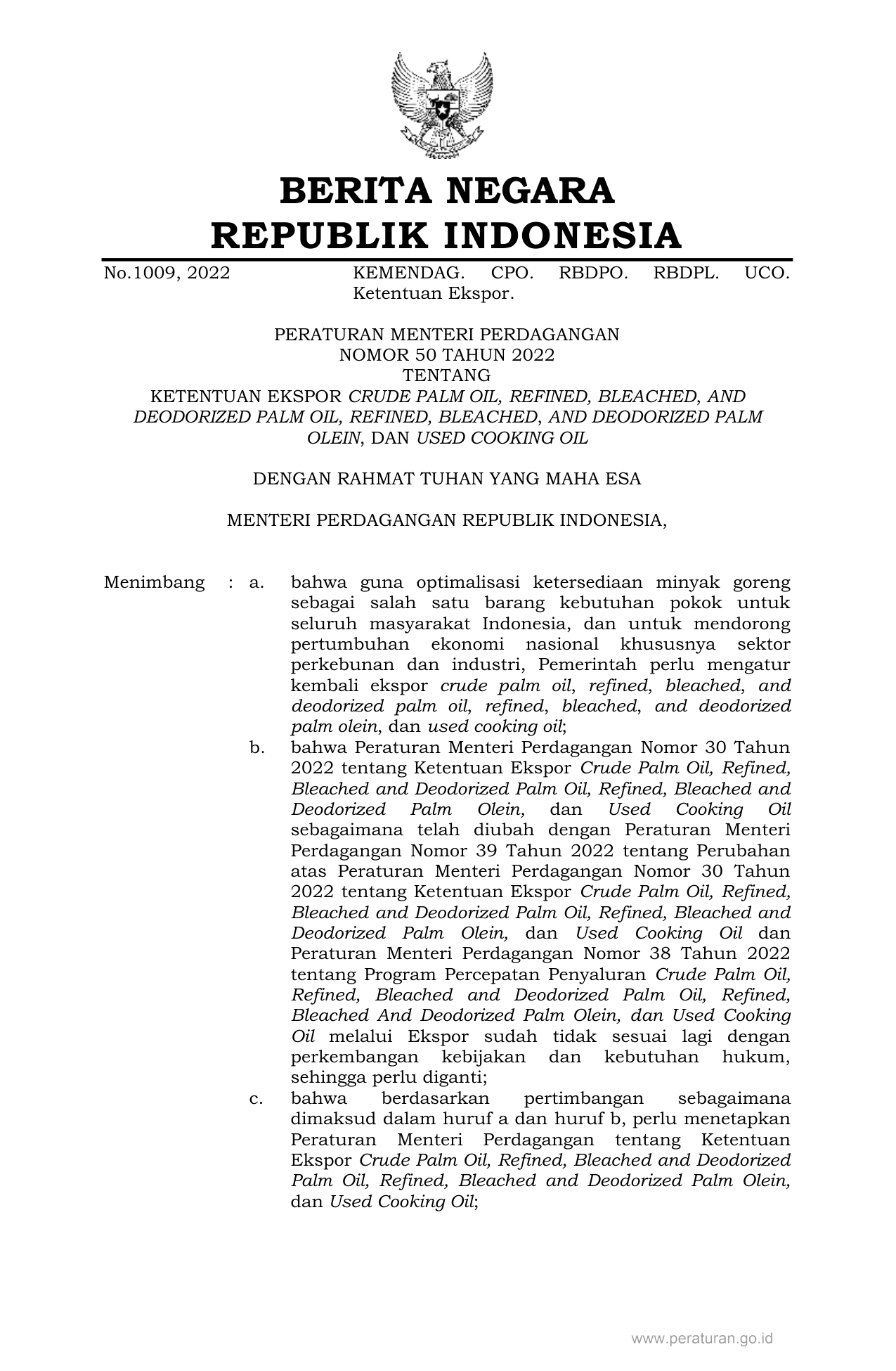 PERMEN Nomor 50 Tahun 2022 | Peraturan Menteri Nomor 50 Tahun 2022 tentang KETENTUAN EKSPOR CRUDE PALM OIL, REFINED, BLEACHED, AND DEODORIZED PALM OIL, REFINED, BLEACHED, AND DEODORIZED PALM OLEIN, DAN USED COOKING OIL