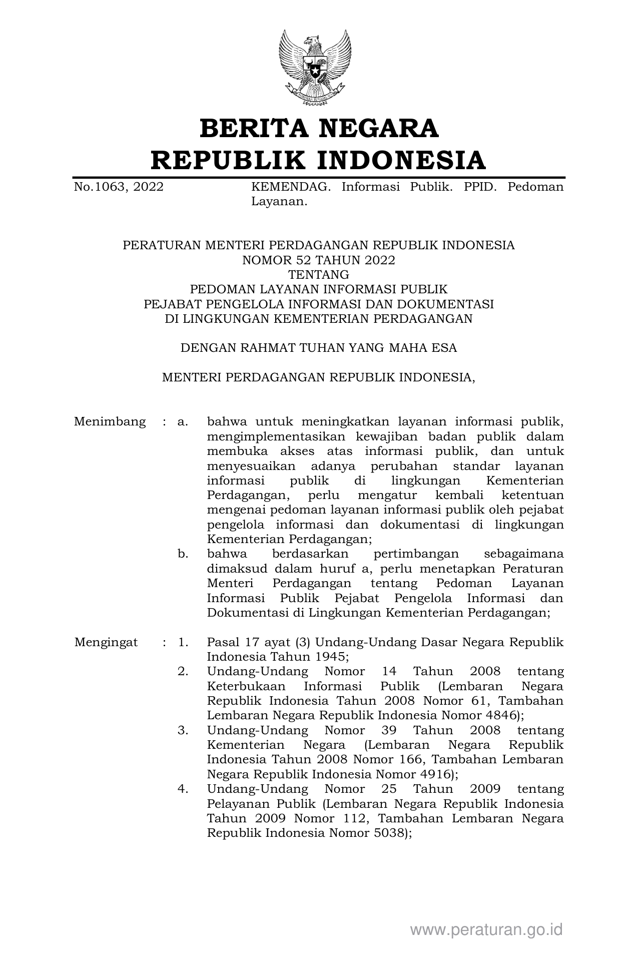 PERMEN Nomor 52 Tahun 2022 | Peraturan Menteri Nomor 52 Tahun 2022 tentang PEDOMAN LAYANAN INFORMASI PUBLIK PEJABAT PENGELOLA INFORMASI DAN DOKUMENTASI DI LINGKUNGAN KEMENTERIAN PERDAGANGAN