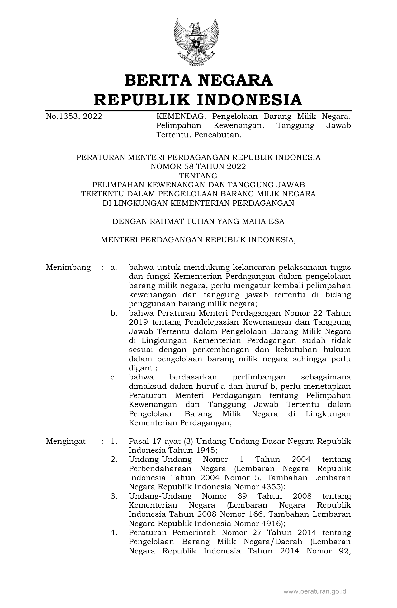 PERMEN Nomor 58 Tahun 2022 | Peraturan Menteri Nomor 58 Tahun 2022 tentang PELIMPAHAN KEWENANGAN DAN TANGGUNG JAWAB TERTENTU DALAM PENGELOLAAN BARANG MILIK NEGARA DI LINGKUNGAN KEMENTERIAN PERDAGANGAN