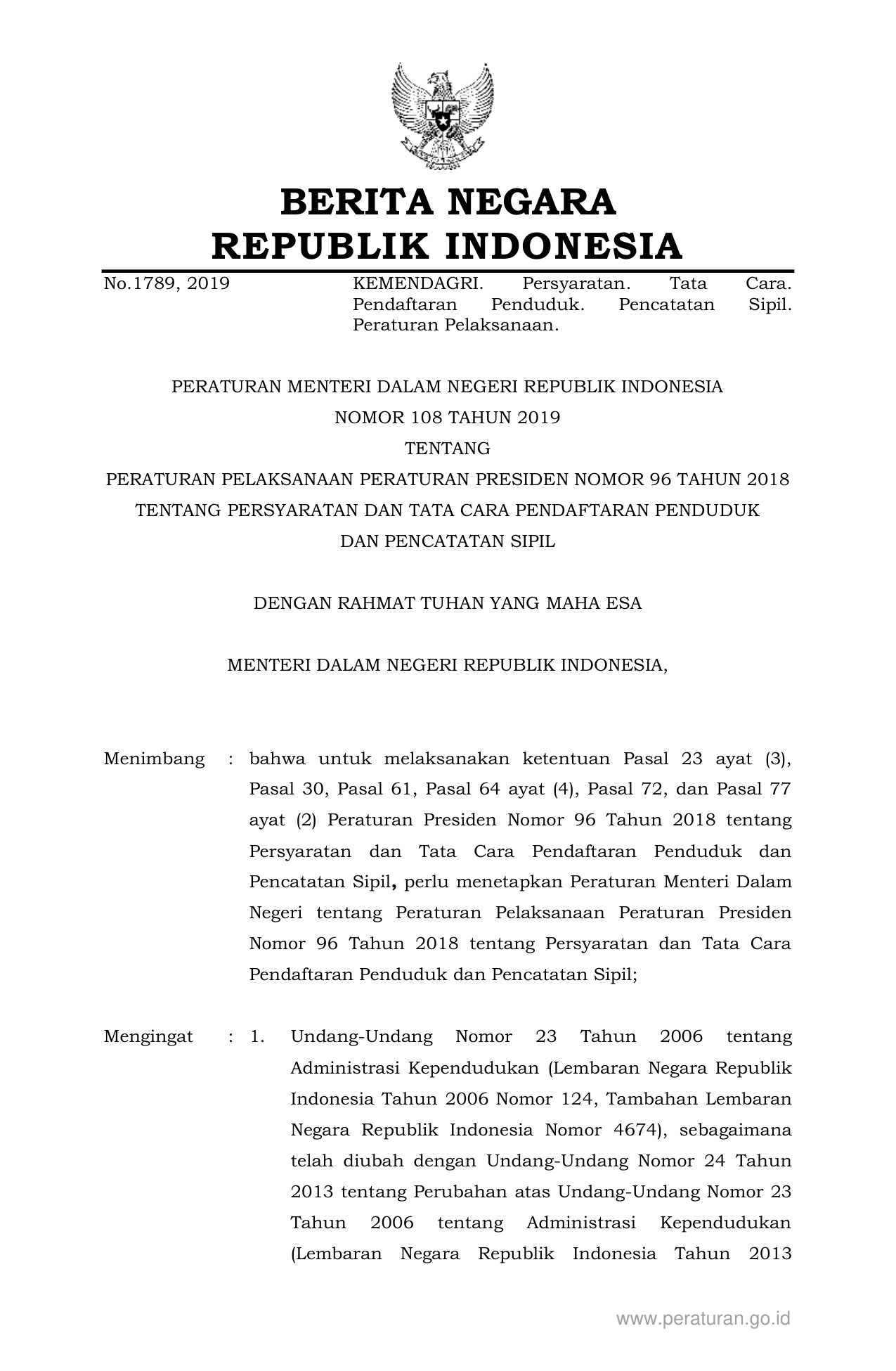 PERMEN Nomor 108 Tahun 2019 | Peraturan Menteri Nomor 108 Tahun 2019 tentang PERATURAN PELAKSANAAN PERATURAN PRESIDEN NOMOR 96 TAHUN 2018 TENTANG PERSYARATAN DAN TATA CARA PENDAFTARAN PENDUDUK DAN PENCATATAN SIPIL