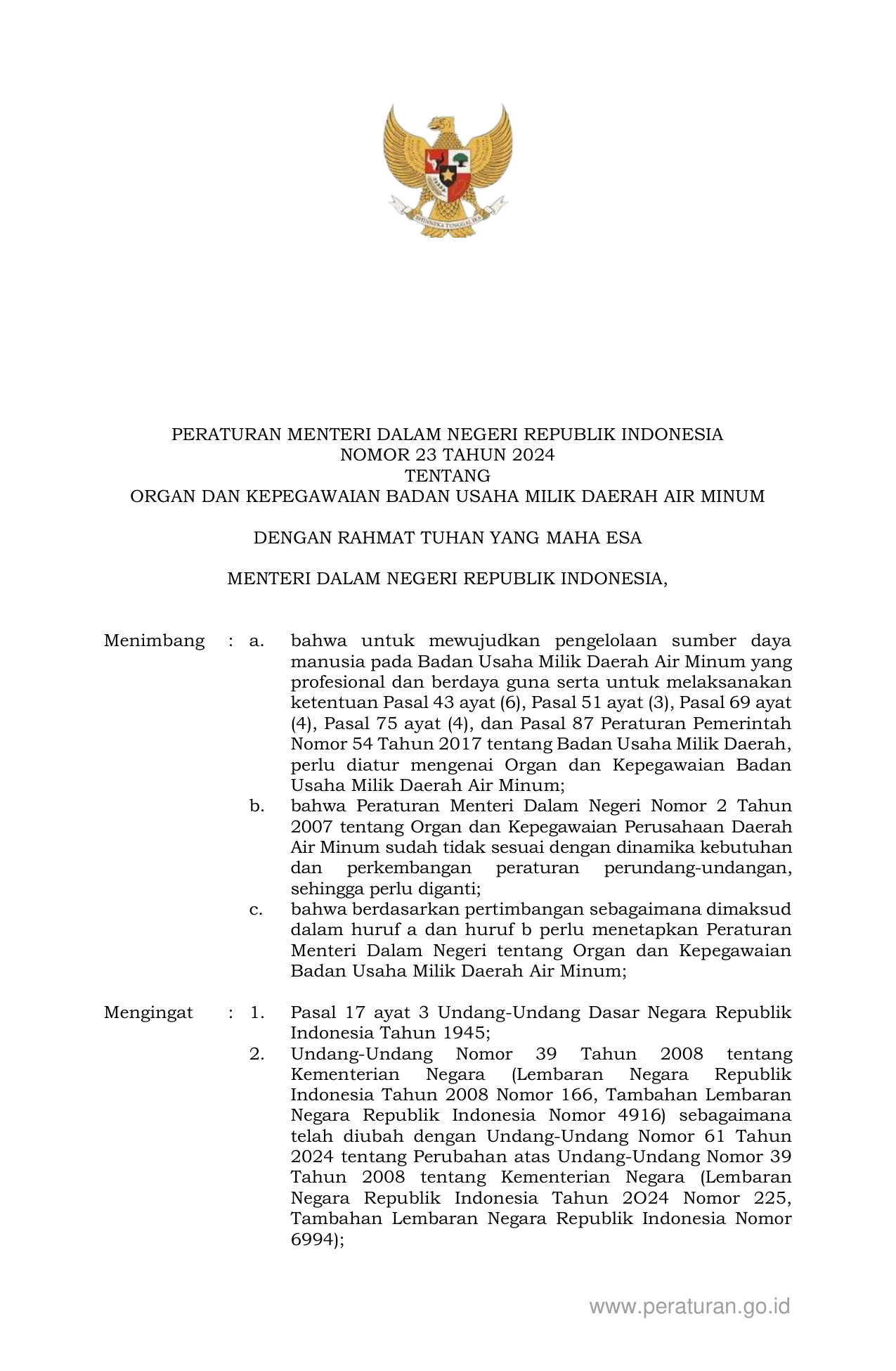 PERMEN Nomor 23 Tahun 2024 | Peraturan Menteri Nomor 23 Tahun 2024 tentang ORGAN DAN KEPEGAWAIAN BADAN USAHA MILIK DAERAH AIR MINUM