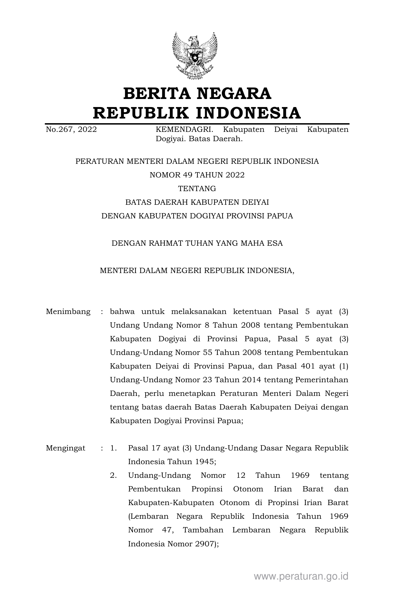 PERMEN Nomor 49 Tahun 2022 | Peraturan Menteri Nomor 49 Tahun 2022 tentang BATAS DAERAH KABUPATEN DEIYAI DENGAN KABUPATEN DOGIYAI PROVINSI PAPUA