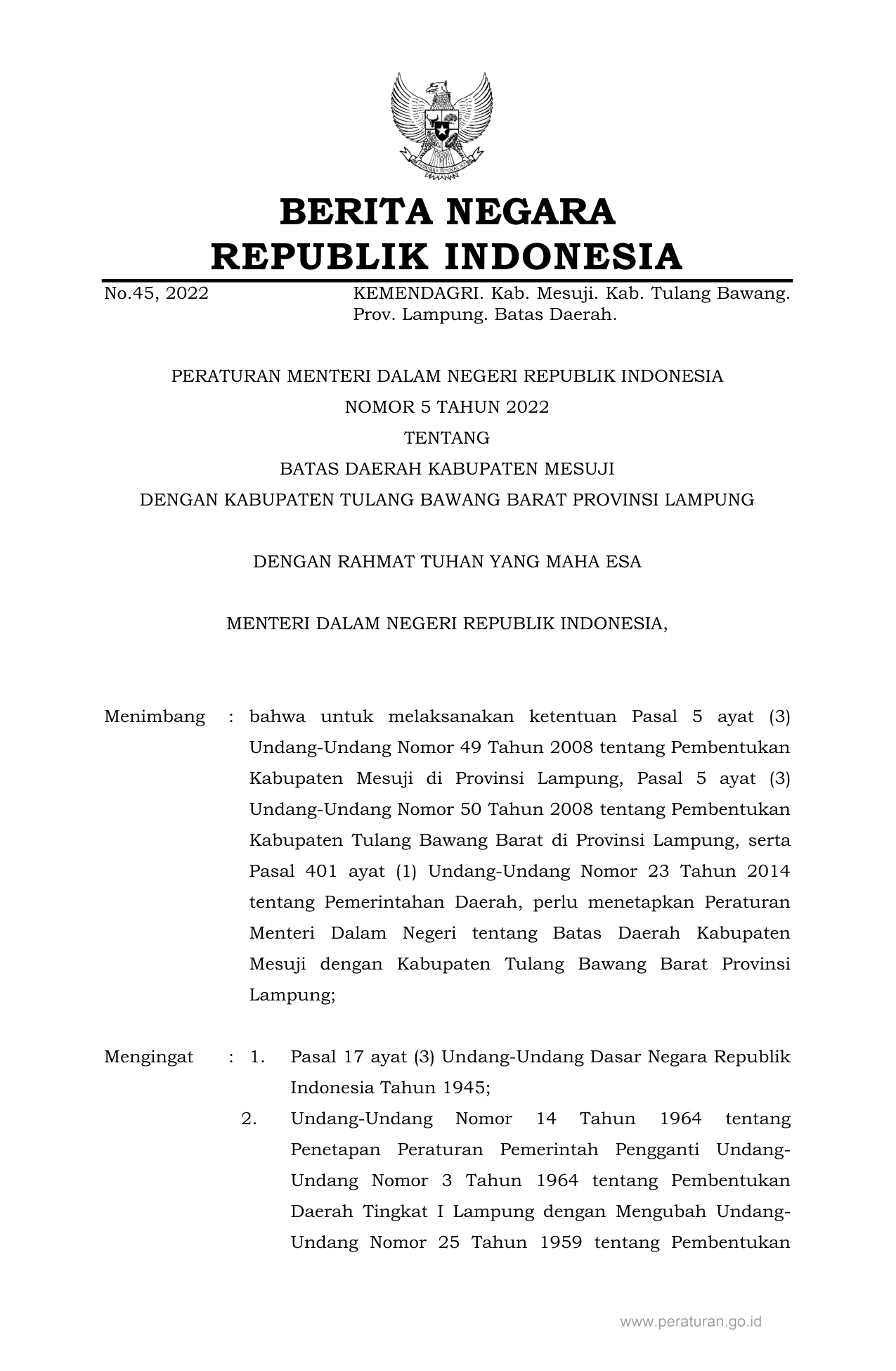 PERMEN Nomor 5 Tahun 2022 | Peraturan Menteri Nomor 5 Tahun 2022 tentang BATAS DAERAH KABUPATEN MESUJI DENGAN KABUPATEN TULANG BAWANG BARAT PROVINSI LAMPUNG