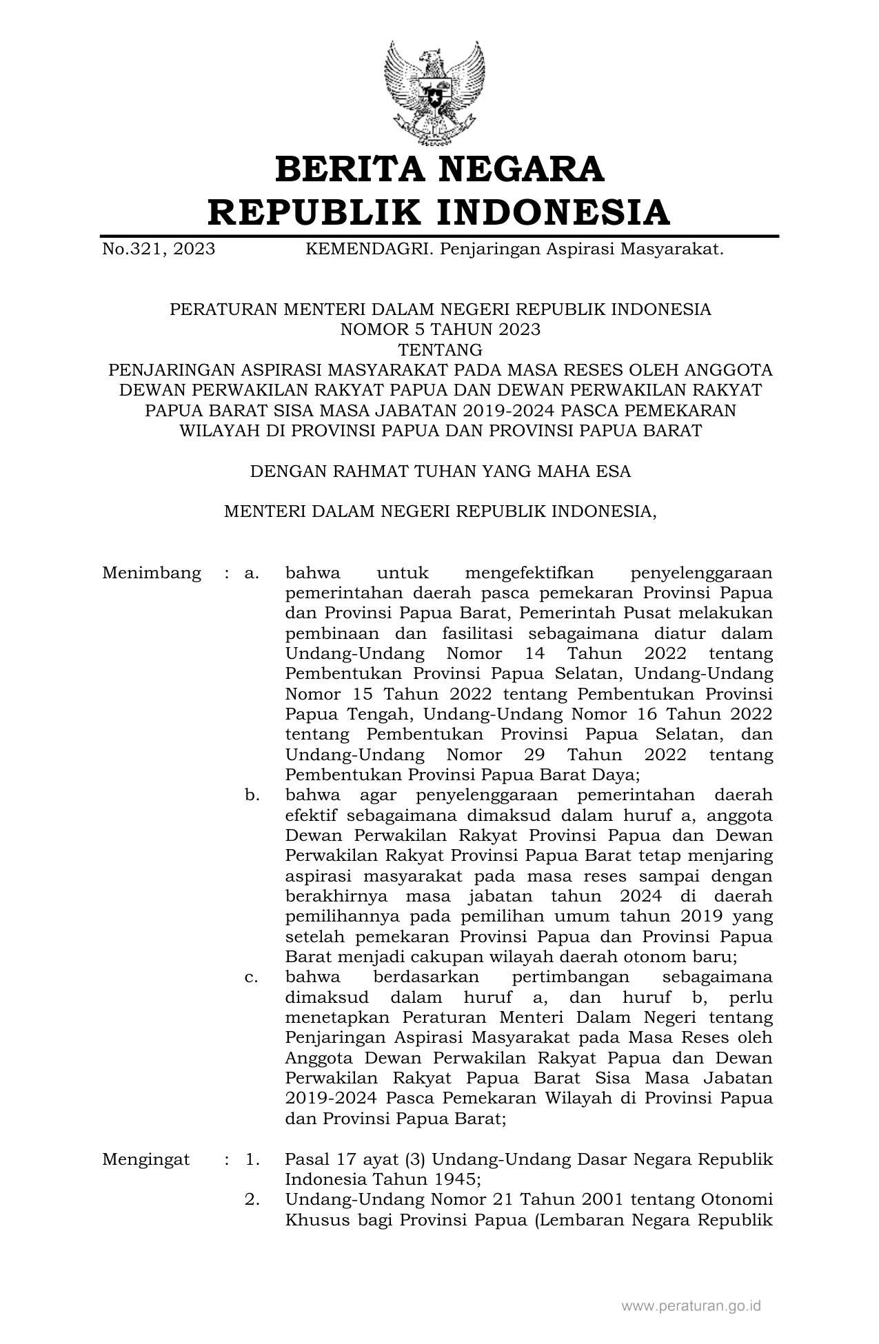 PERMEN Nomor 5 Tahun 2023 | Peraturan Menteri Nomor 5 Tahun 2023 tentang PENJARINGAN ASPIRASI MASYARAKAT PADA MASA RESES OLEH ANGGOTA DEWAN PERWAKILAN RAKYAT PAPUA DAN DEWAN PERWAKILAN RAKYAT PAPUA BARAT SISA MASA JABATAN 2019-2024 PASCA PEMEKARAN WILAYAH DI PROVINSI PAPUA DAN PROVINSI PAPUA BARAT