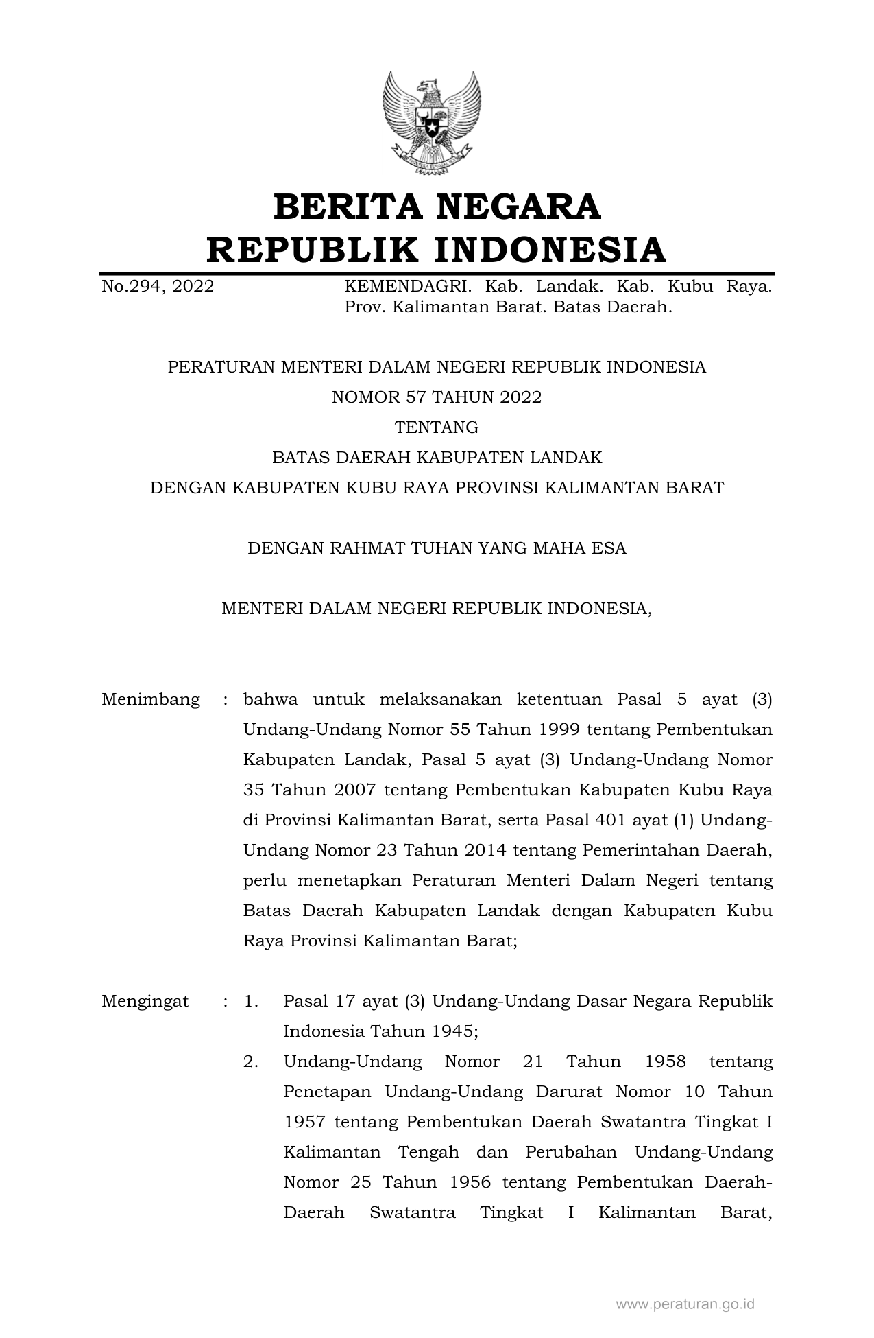PERMEN Nomor 57 Tahun 2022 | Peraturan Menteri Nomor 57 Tahun 2022 tentang BATAS DAERAH KABUPATEN LANDAK DENGAN KABUPATEN KUBU RAYA PROVINSI KALIMANTAN BARAT