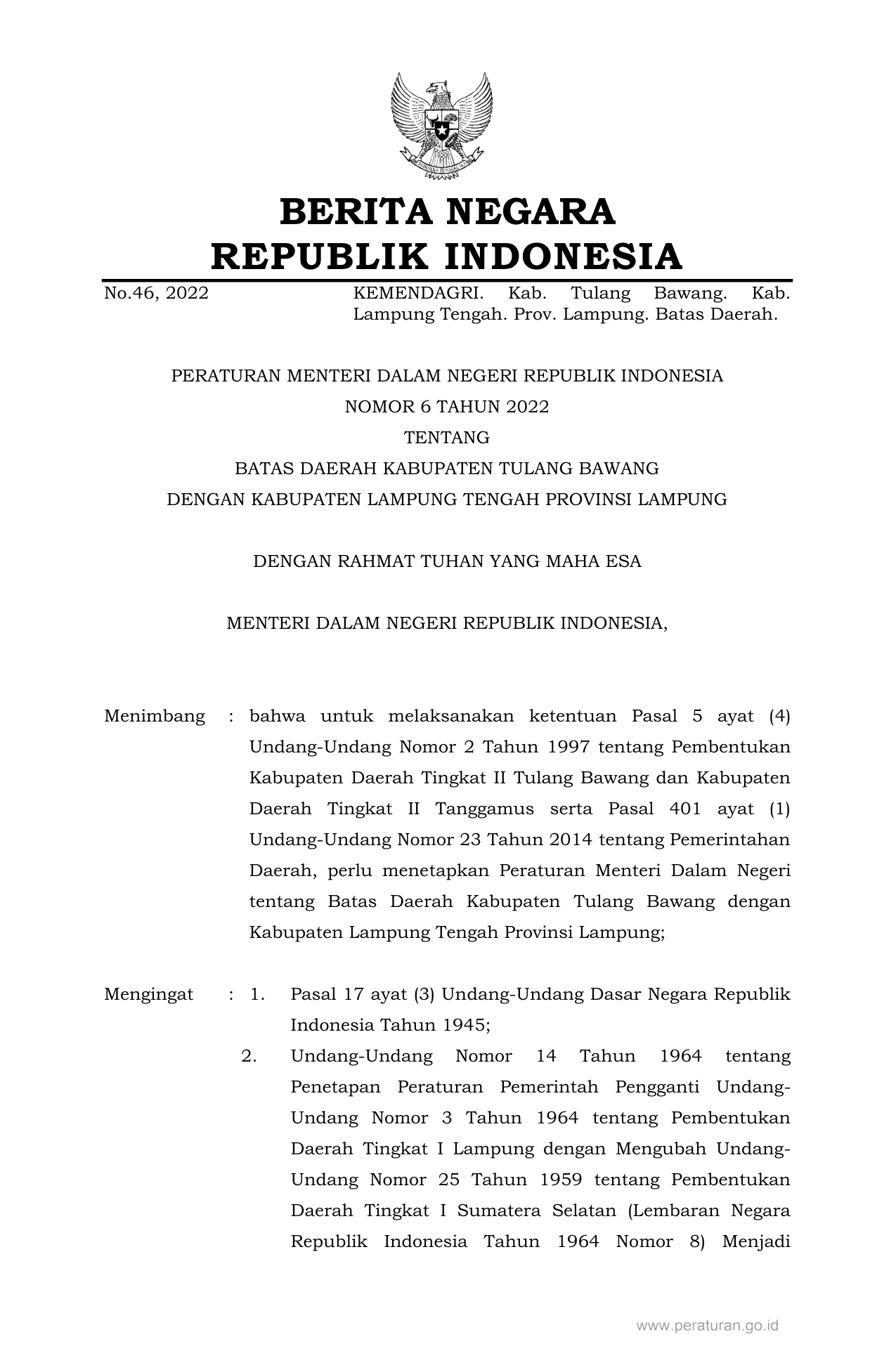 PERMEN Nomor 6 Tahun 2022 | Peraturan Menteri Nomor 6 Tahun 2022 tentang BATAS DAERAH KABUPATEN TULANG BAWANG DENGAN KABUPATEN LAMPUNG TENGAH PROVINSI LAMPUNG