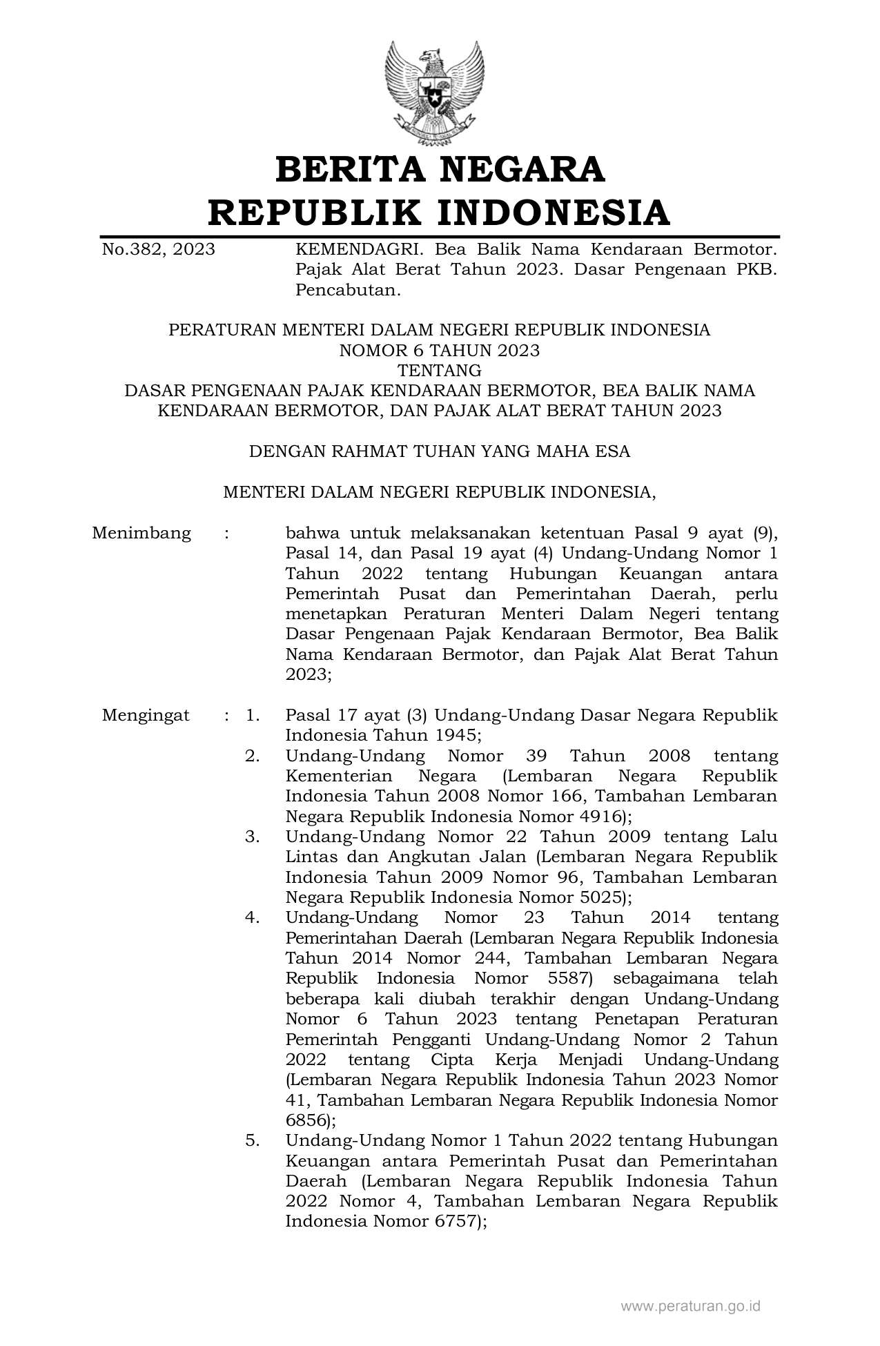 PERMEN Nomor 6 Tahun 2023 | Peraturan Menteri Nomor 6 Tahun 2023 tentang DASAR PENGENAAN PAJAK KENDARAAN BERMOTOR, BEA BALIK NAMA KENDARAAN BERMOTOR, DAN PAJAK ALAT BERAT TAHUN 2023