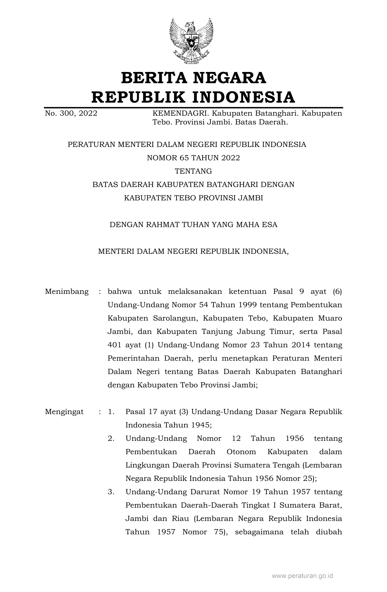 PERMEN Nomor 65 Tahun 2022 | Peraturan Menteri Nomor 65 Tahun 2022 tentang BATAS DAERAH KABUPATEN BATANGHARI DENGAN KABUPATEN TEBO PROVINSI JAMBI