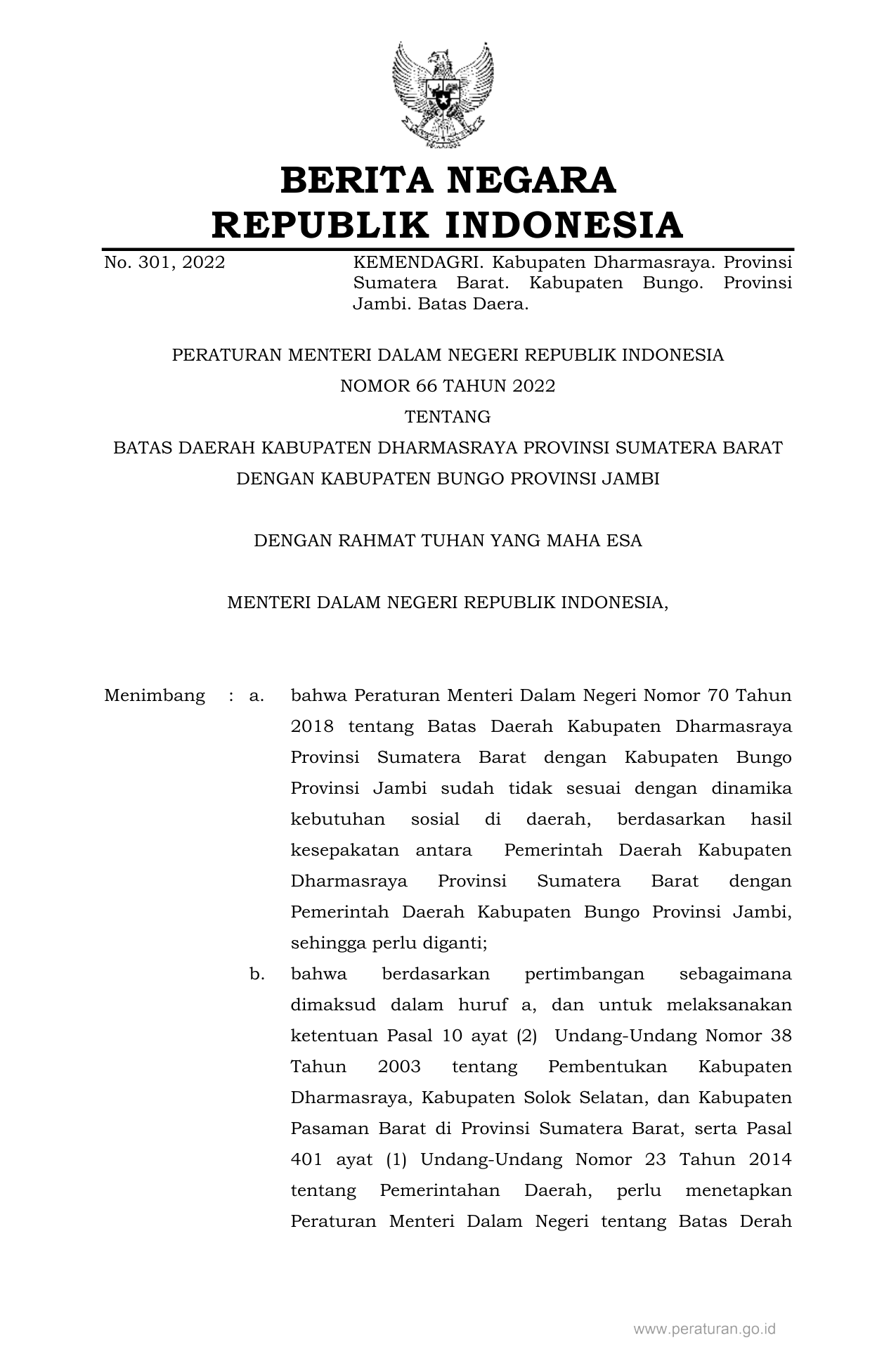 PERMEN Nomor 66 Tahun 2022 | Peraturan Menteri Nomor 66 Tahun 2022 tentang BATAS DAERAH KABUPATEN DHARMASRAYA PROVINSI SUMATERA BARAT DENGAN KABUPATEN BUNGO PROVINSI JAMBI