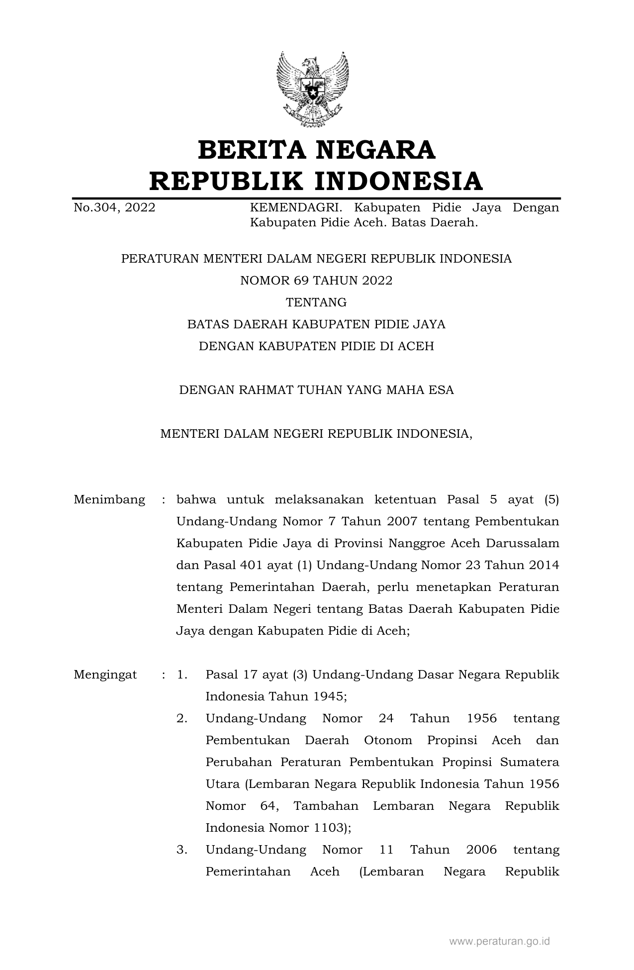 PERMEN Nomor 69 Tahun 2022 | Peraturan Menteri Nomor 69 Tahun 2022 tentang BATAS DAERAH KABUPATEN PIDIE JAYA DENGAN KABUPATEN PIDIE DI ACEH