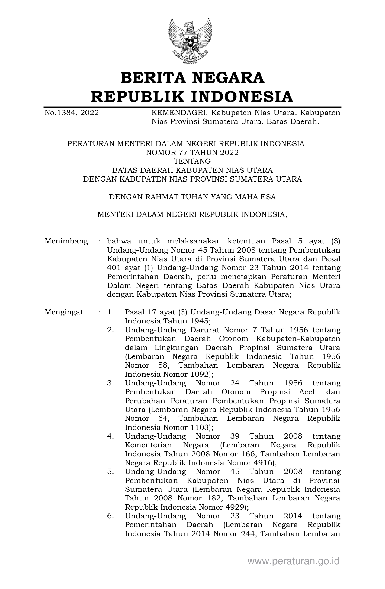PERMEN Nomor 77 Tahun 2022 | Peraturan Menteri Nomor 77 Tahun 2022 tentang BATAS DAERAH KABUPATEN NIAS UTARA DENGAN KABUPATEN NIAS PROVINSI SUMATERA UTARA