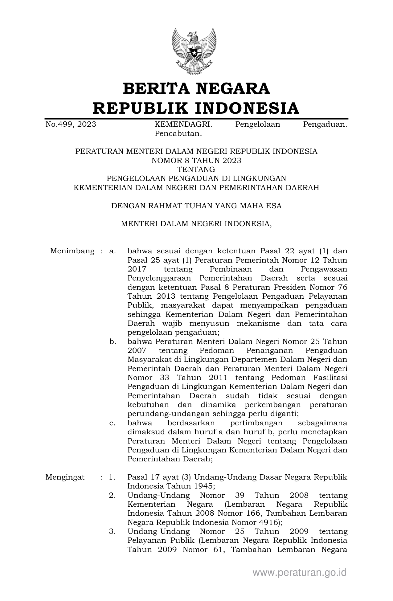 PERMEN Nomor 8 Tahun 2023 | Peraturan Menteri Nomor 8 Tahun 2023 tentang PENGELOLAAN PENGADUAN DI LINGKUNGAN KEMENTERIAN DALAM NEGERI DAN PEMERINTAHAN DAERAH