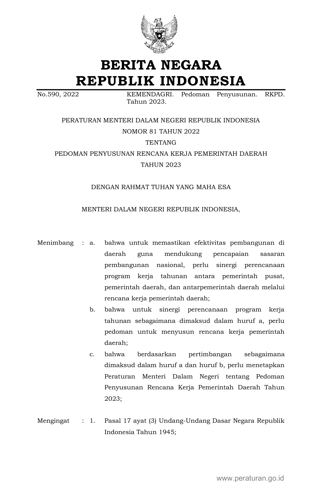 PERMEN Nomor 81 Tahun 2022 | Peraturan Menteri Nomor 81 Tahun 2022 tentang PEDOMAN PENYUSUNAN RENCANA KERJA PEMERINTAH DAERAH TAHUN 2023