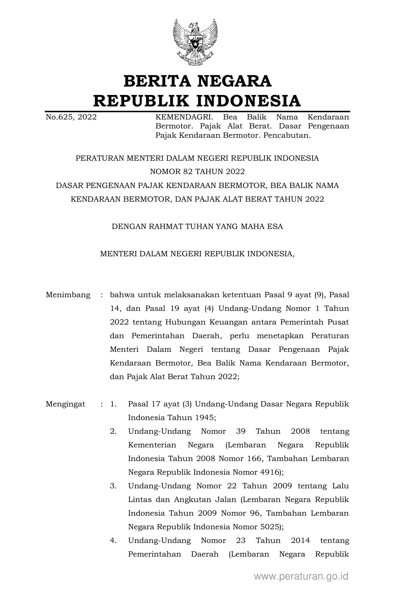 PERMEN Nomor 82 Tahun 2022 | Peraturan Menteri Nomor 82 Tahun 2022 tentang DASAR PENGENAAN PAJAK KENDARAAN BERMOTOR, BEA BALIK NAMA KENDARAAN BERMOTOR, DAN PAJAK ALAT BERAT TAHUN 2022