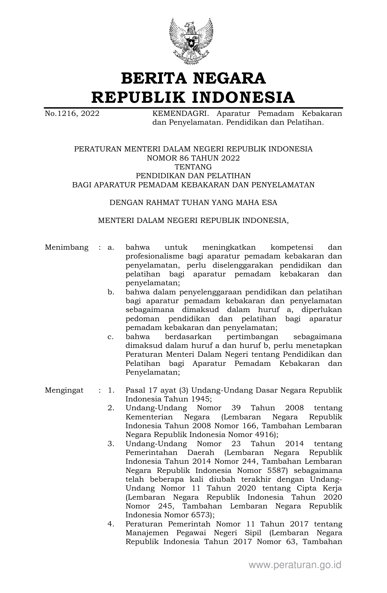 PERMEN Nomor 86 Tahun 2022 | Peraturan Menteri Nomor 86 Tahun 2022 tentang PENDIDIKAN DAN PELATIHAN BAGI APARATUR PEMADAM KEBAKARAN DAN PENYELAMATAN